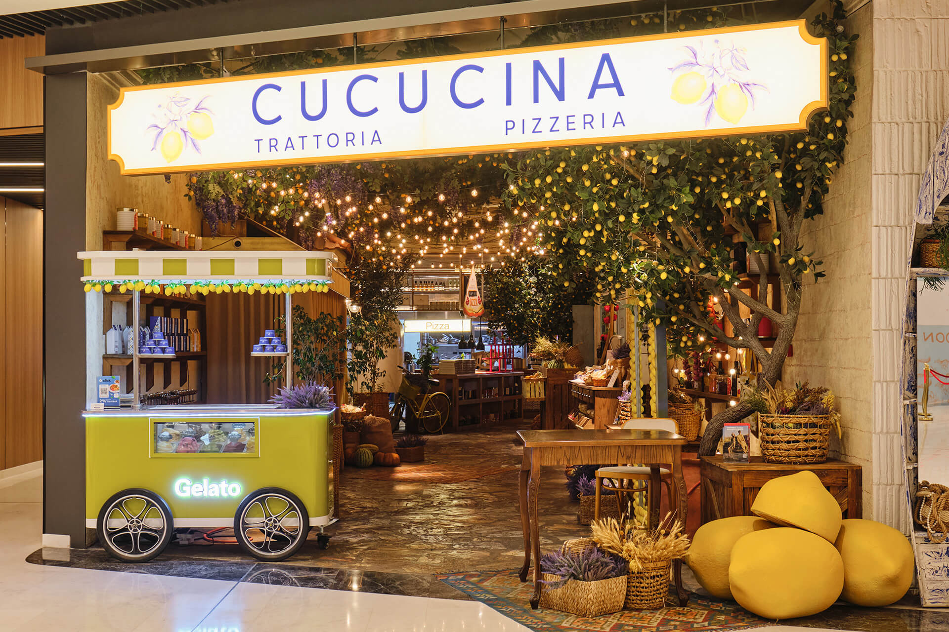 The interior of the venue feels like a warm, lively Italian gastronomic street, tucked inside the building. The space is filled with wood, soft lighting, and details that create a sense of homey comfort, but in a contemporary urban style.