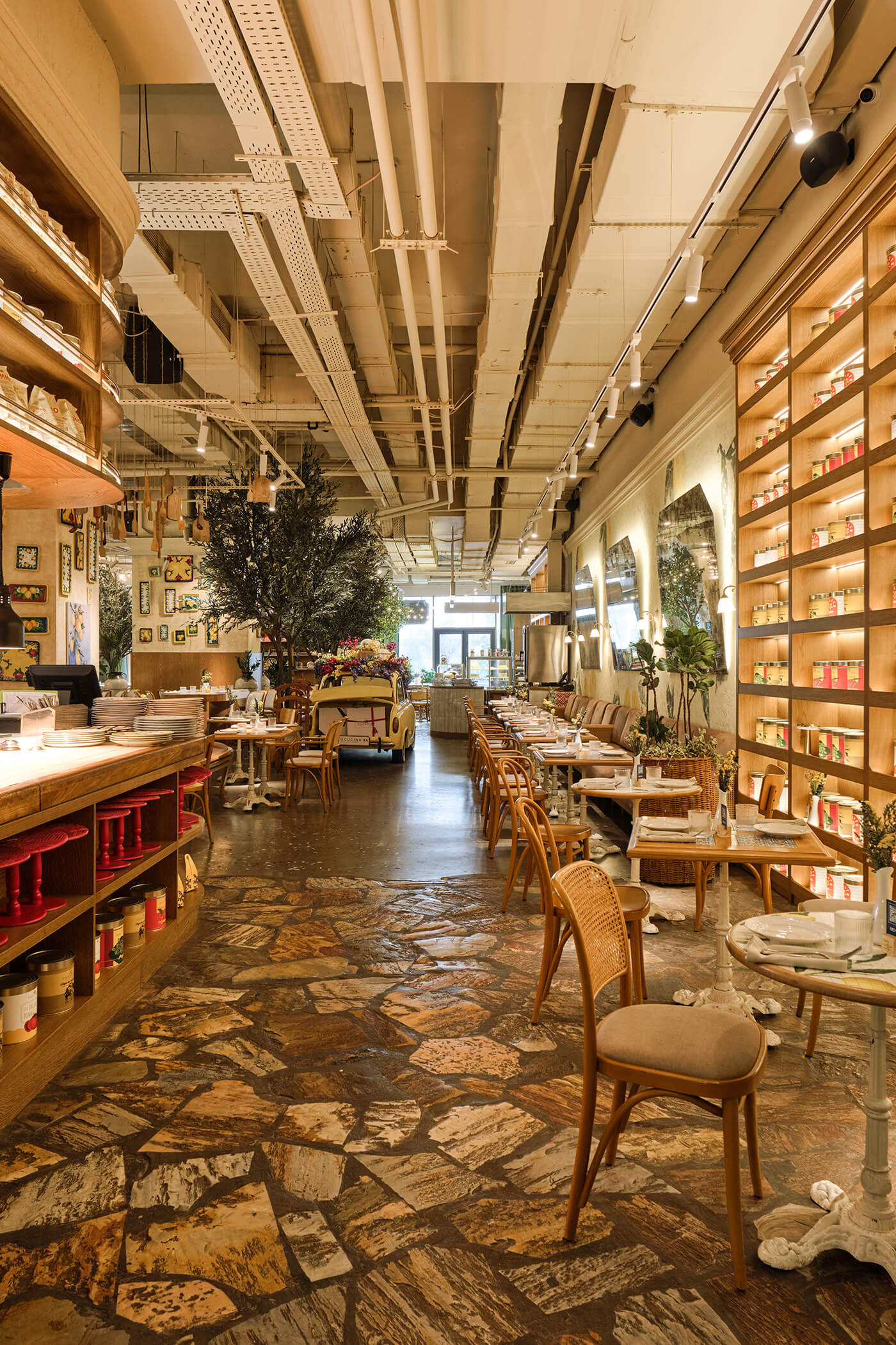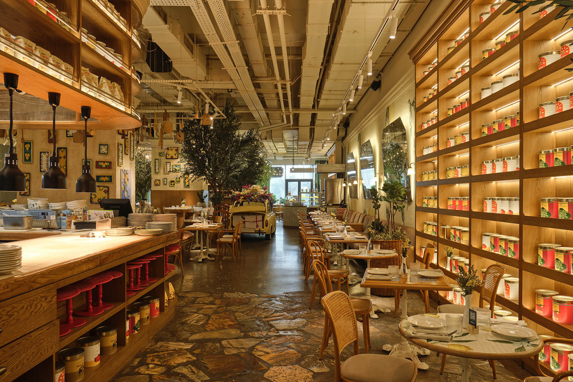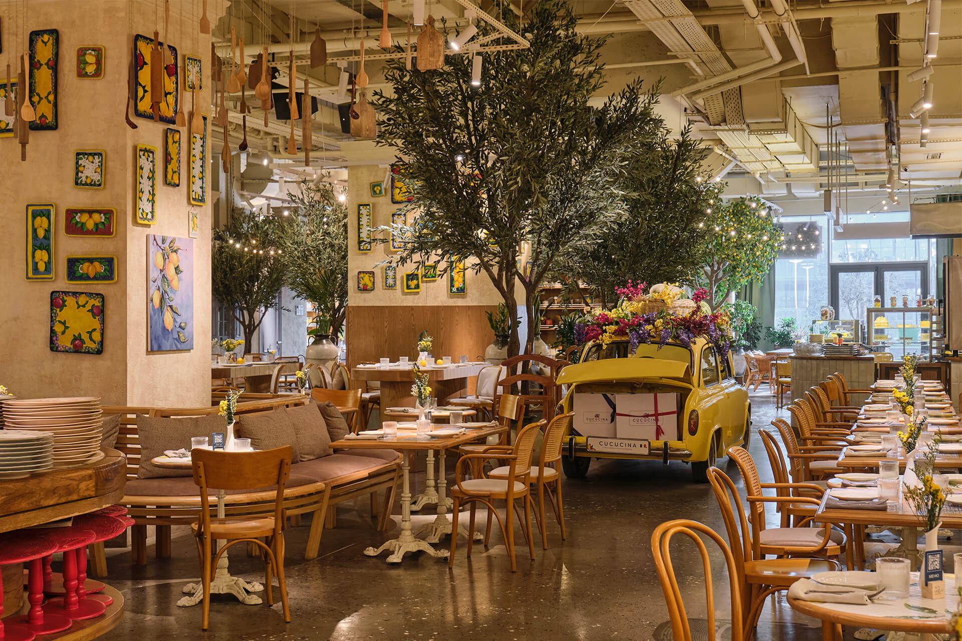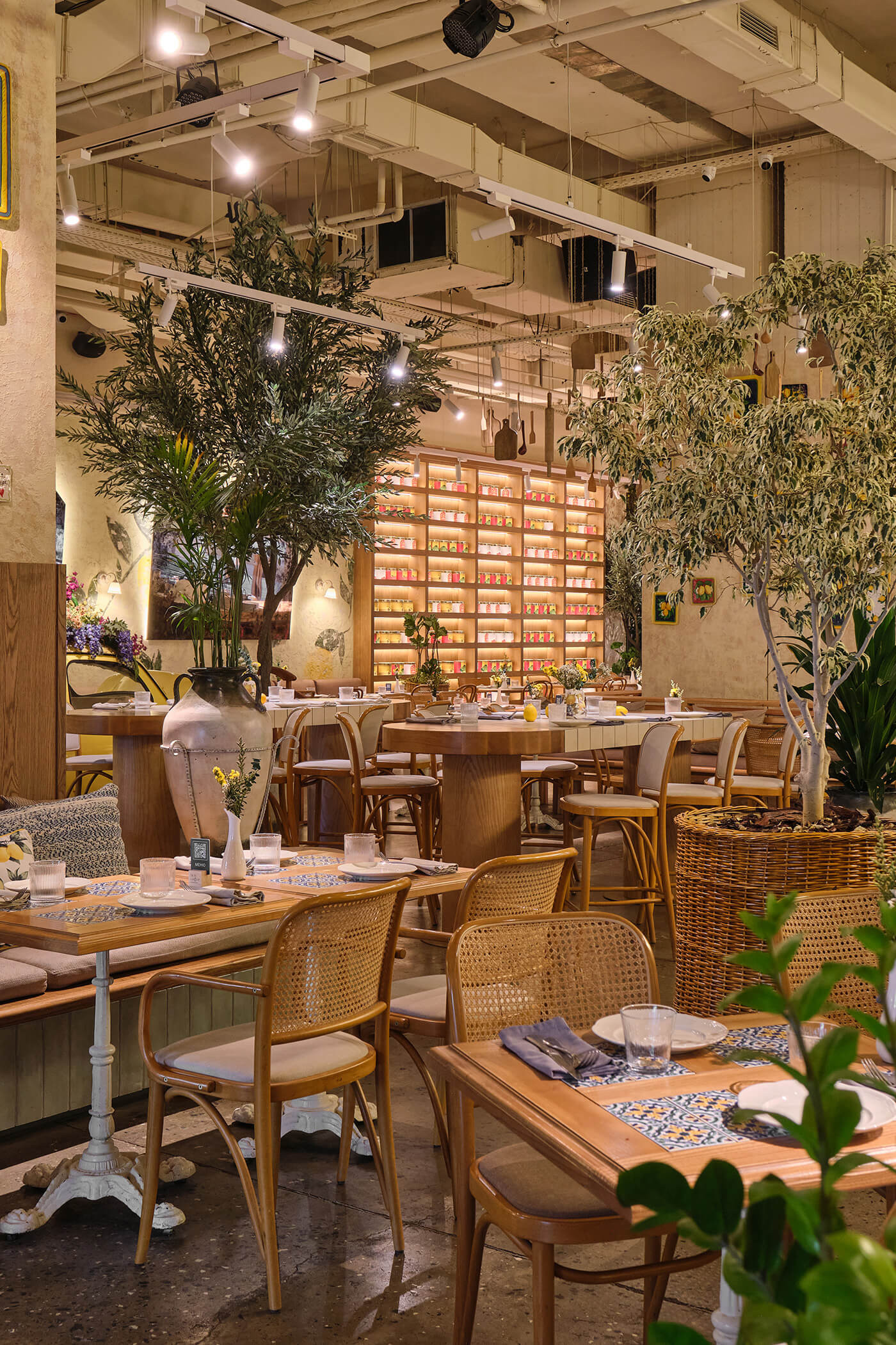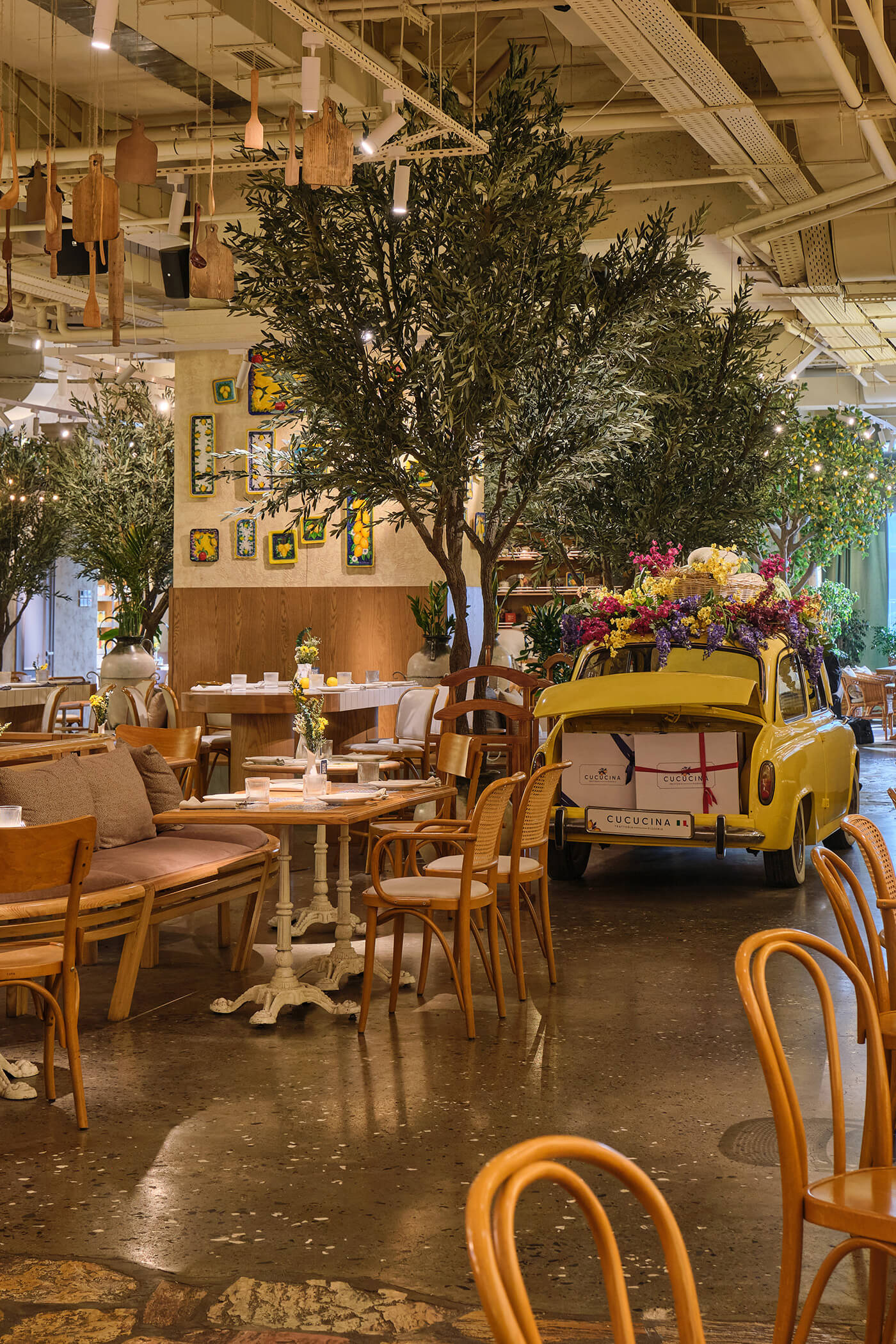 Plants, indoor trees, and floral arrangements bring life and naturalness, softening the industrial ceiling. Altogether, the space combines Italian generosity, urban energy, and the feeling of being a guest in the home of someone who truly loves food and atmosphere.