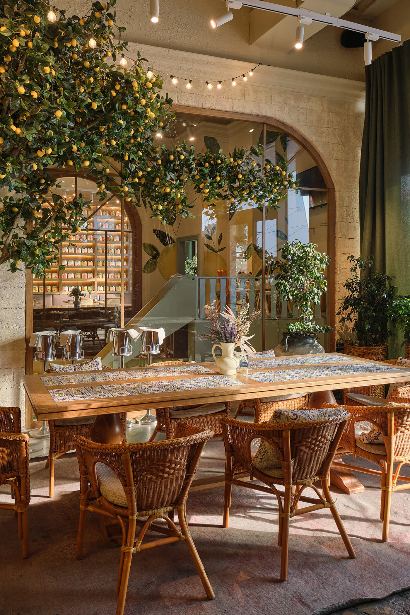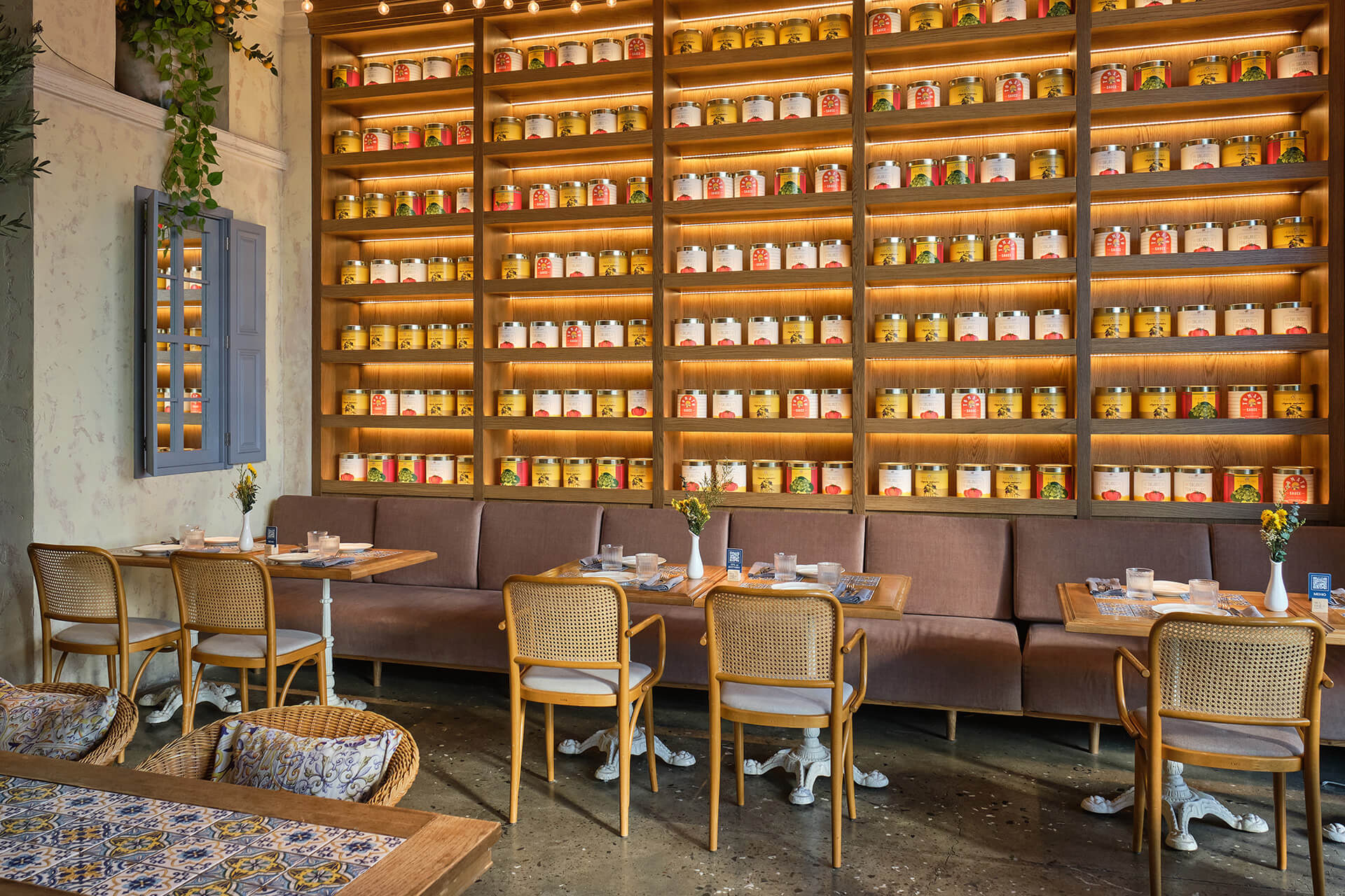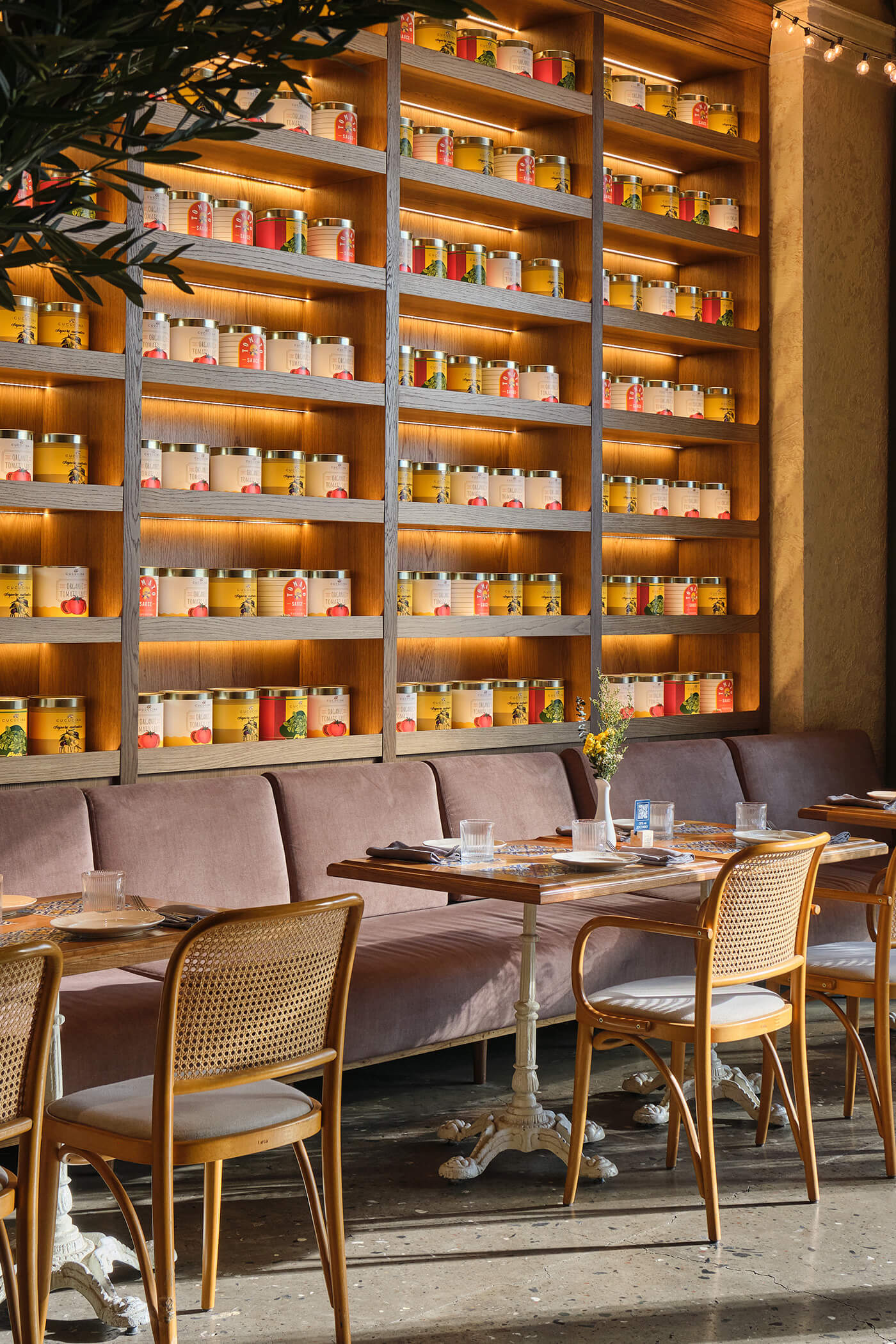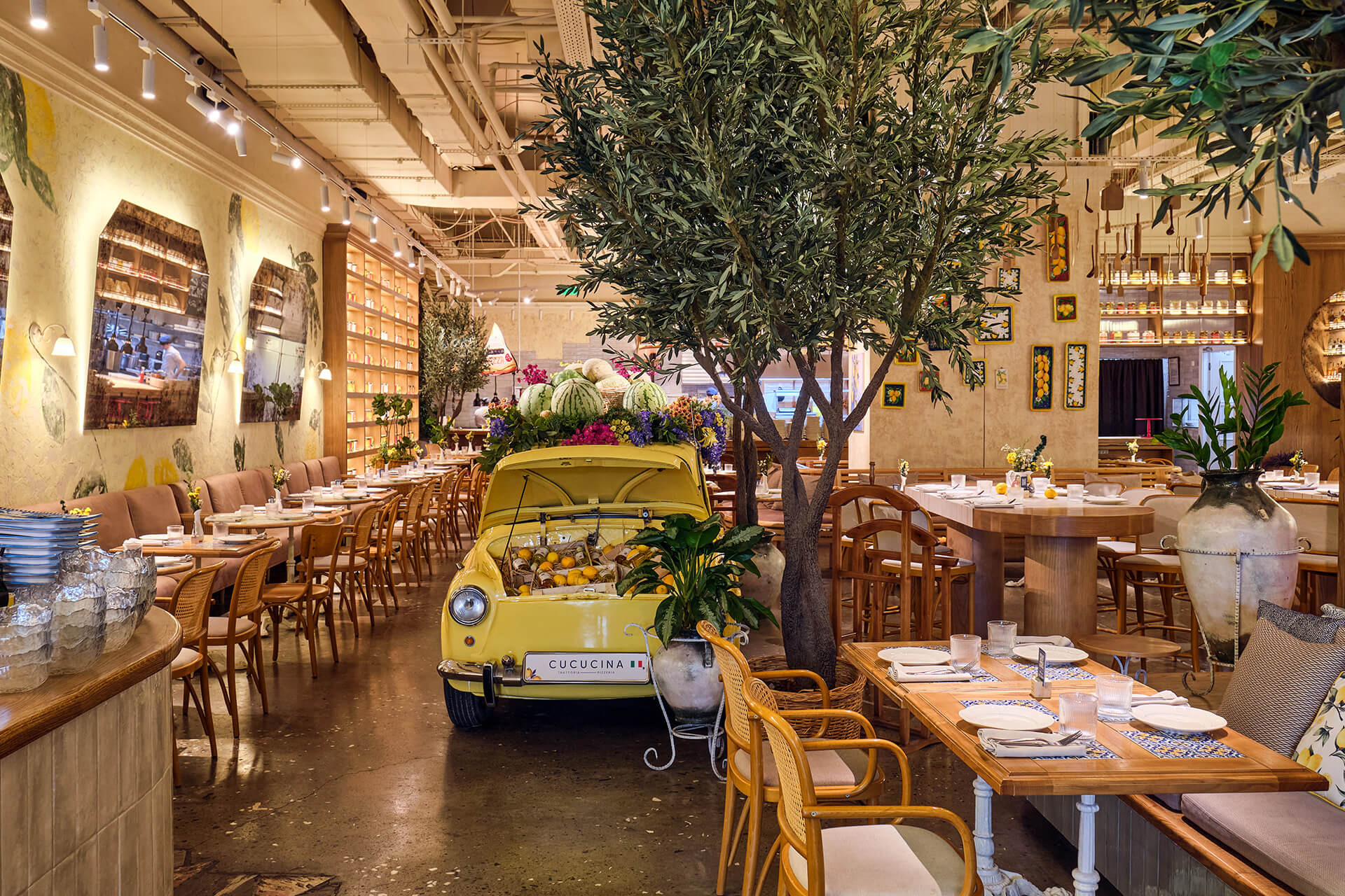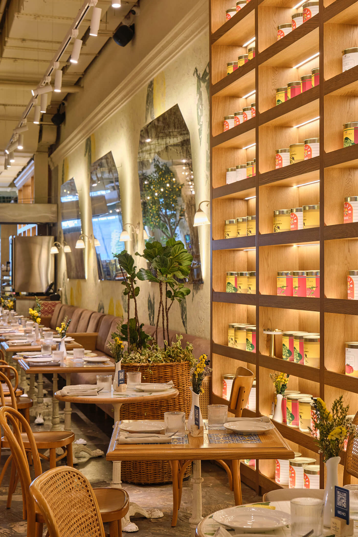 Plants, indoor trees, and floral arrangements bring life and naturalness, softening the industrial ceiling. Altogether, the space combines Italian generosity, urban energy, and the feeling of being a guest in the home of someone who truly loves food and atmosphere.
