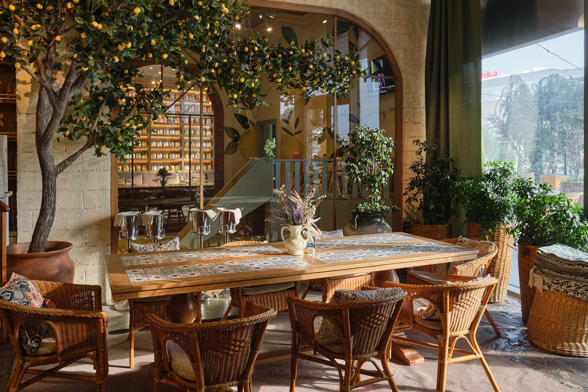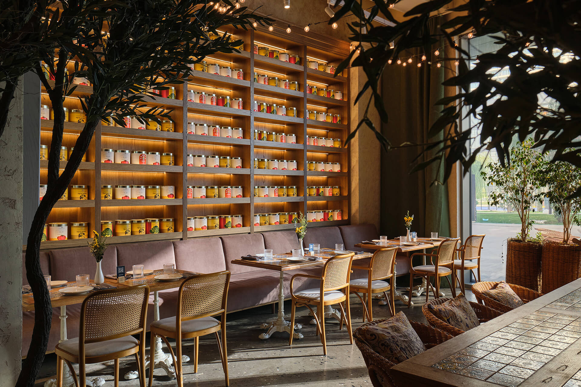 The gentle clatter of dishes, conversations at tables, and the life behind the bar give the impression that you are in the heart of a bustling Italian street. Plants and trees bring freshness, while warm materials — wood, stone, textiles — make the space feel human and “alive.” It’s a place where you want to linger, sip wine, look around, and simply enjoy the moment.
