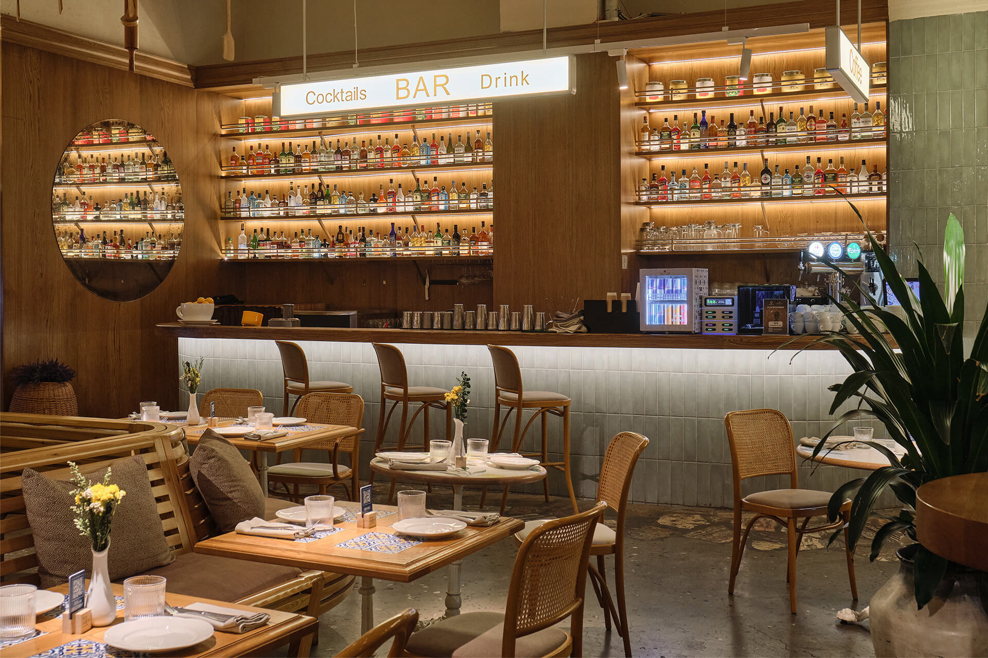 Tall shelves filled with jars, illuminated by warm light, add rhythm, depth, and a sense of abundance. The solid wood bar acts as the center of the venue’s life, constantly in motion: coffee, plates, chatter, movement.