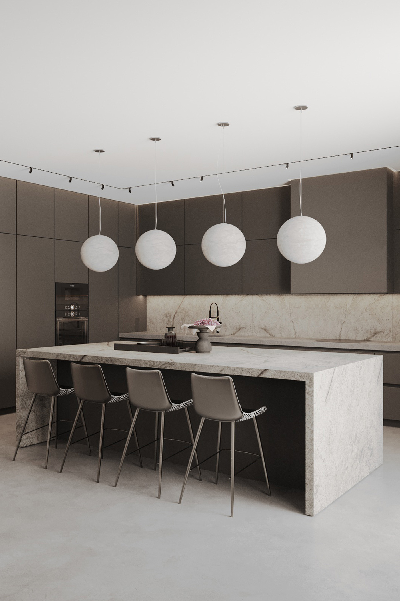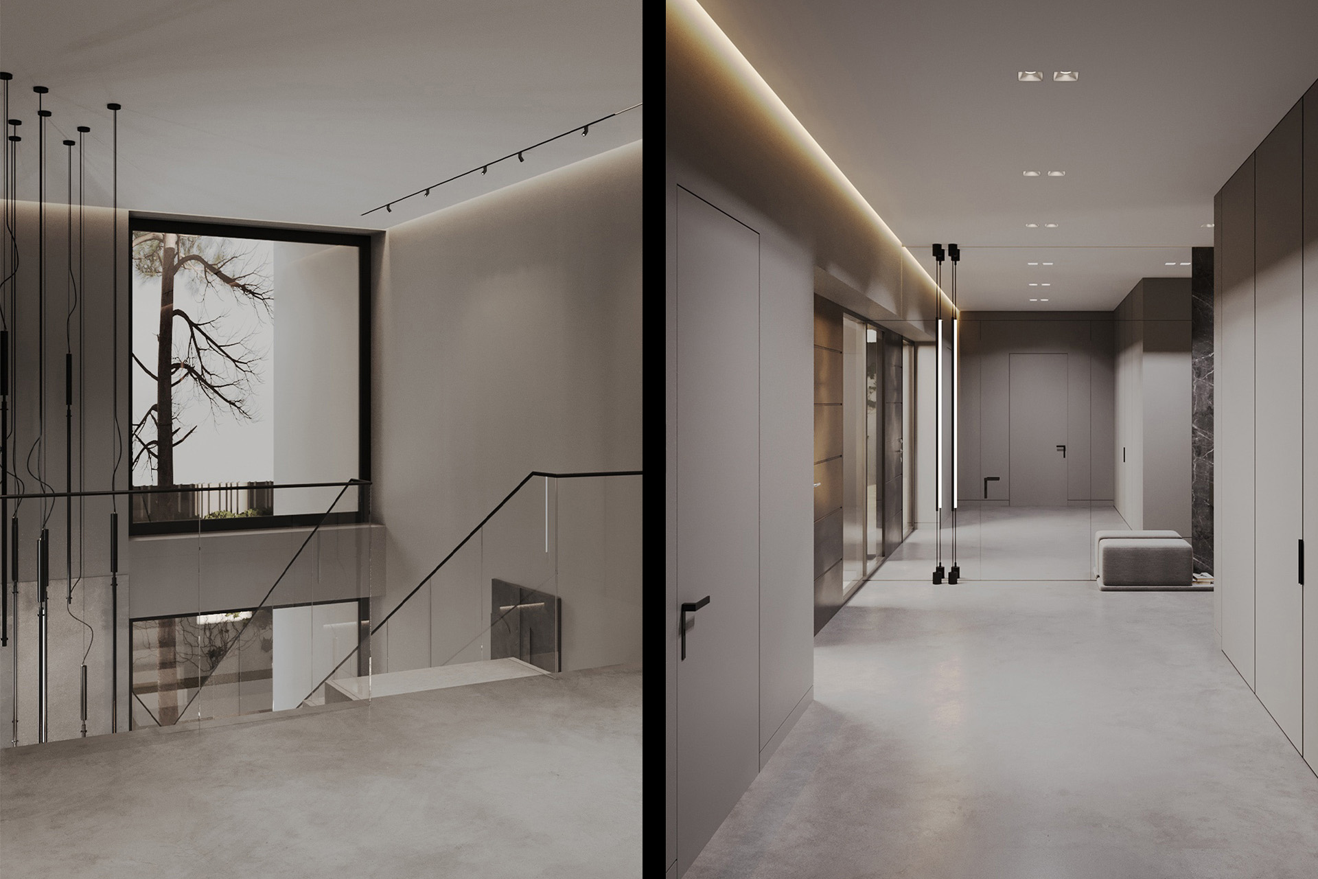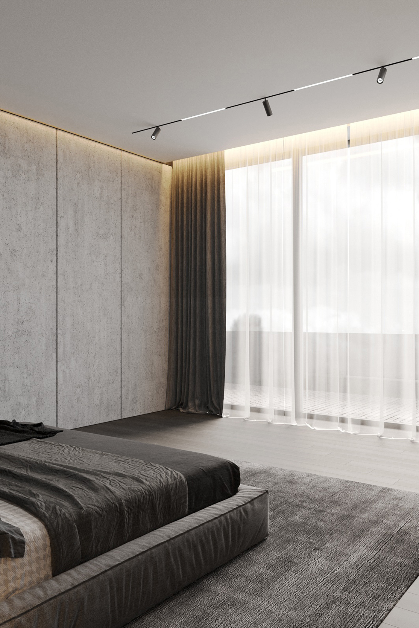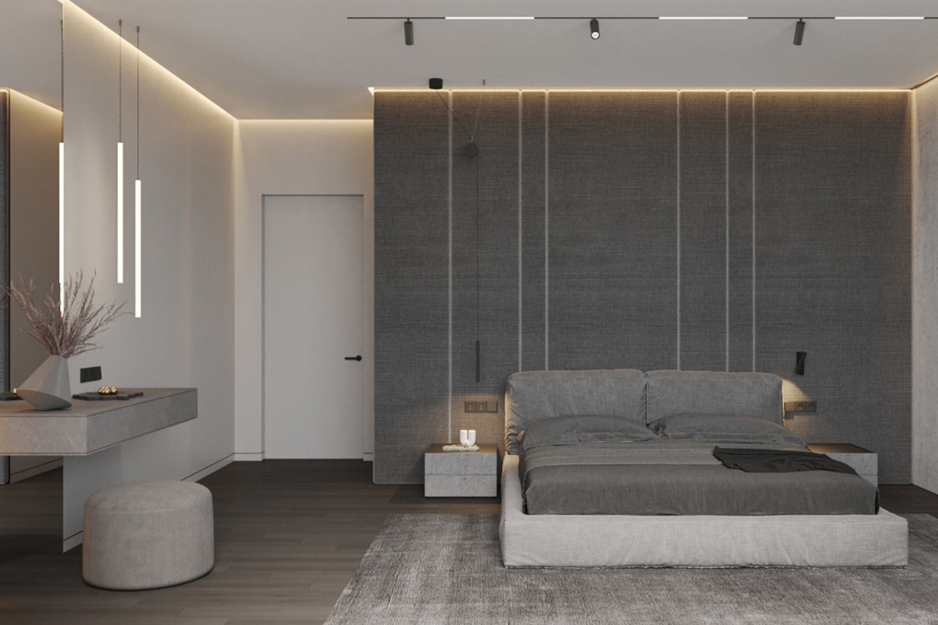 The interior design exemplifies contemporary minimalism with a focus on gray tones. This concept embraces clean lines, uncluttered spaces, and a cohesive color palette.