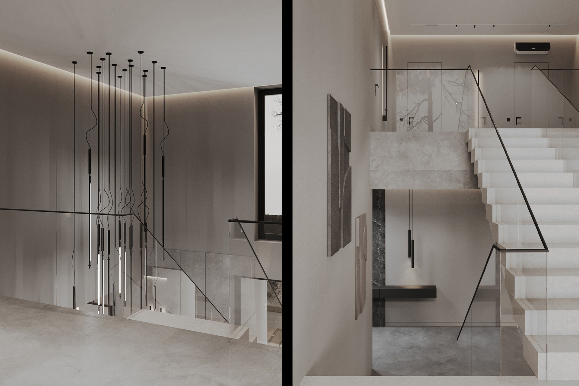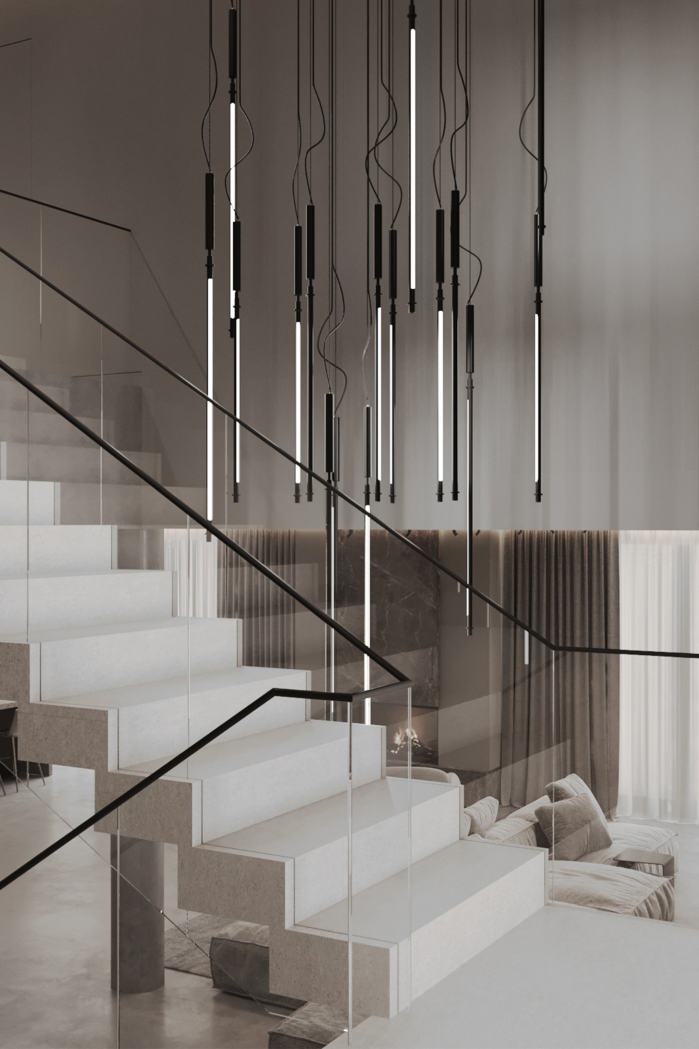 Lighting design enhances the minimalist aesthetic, with linear fixtures and concealed ambient lighting that underscore the architectural clarity.