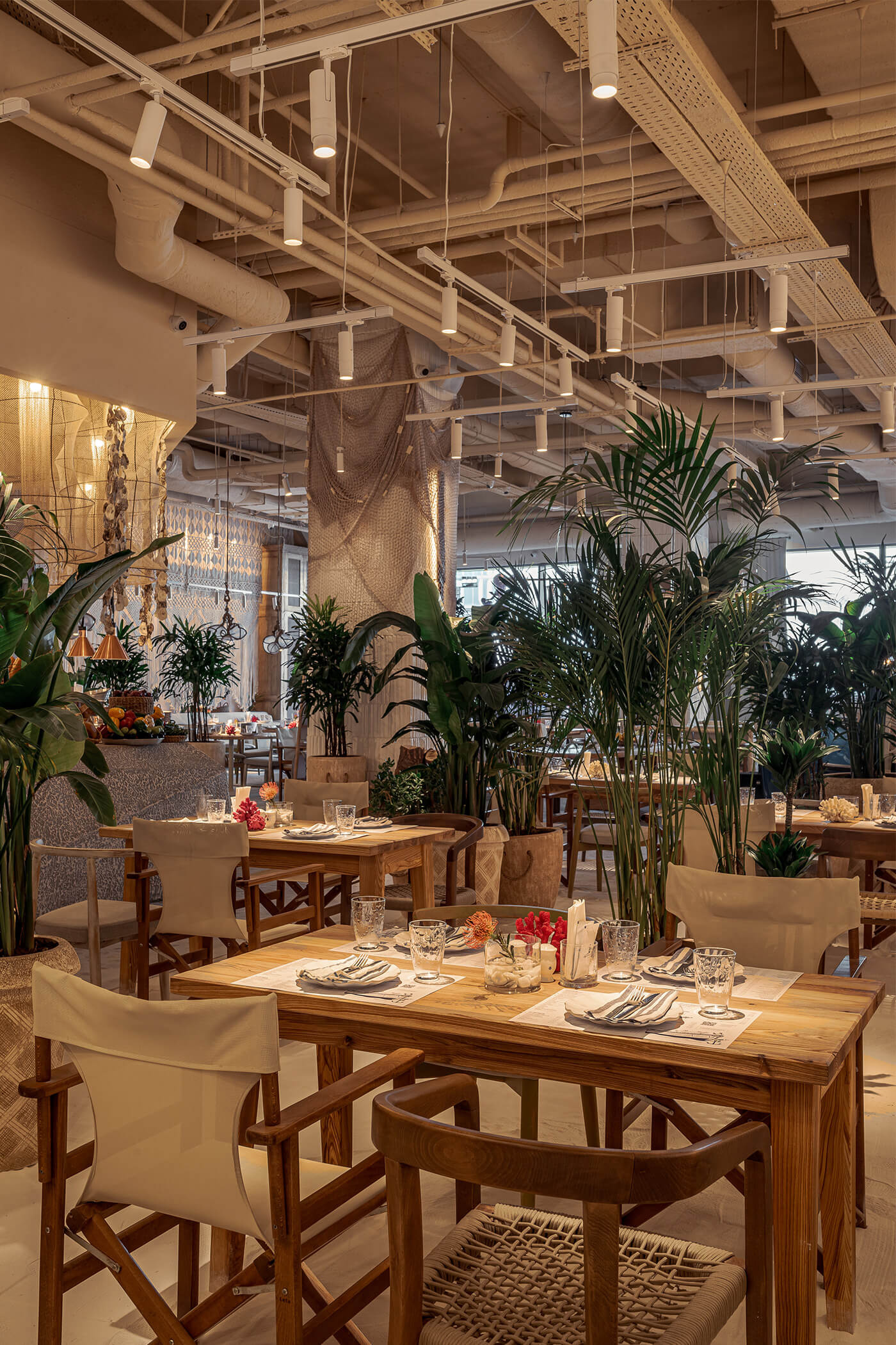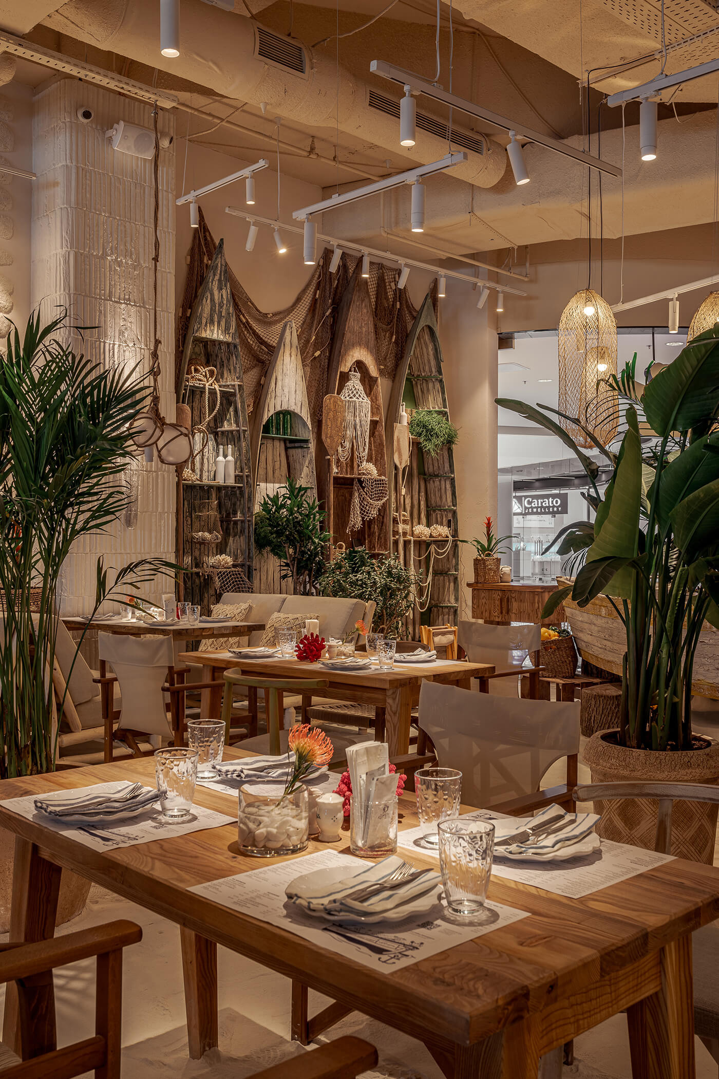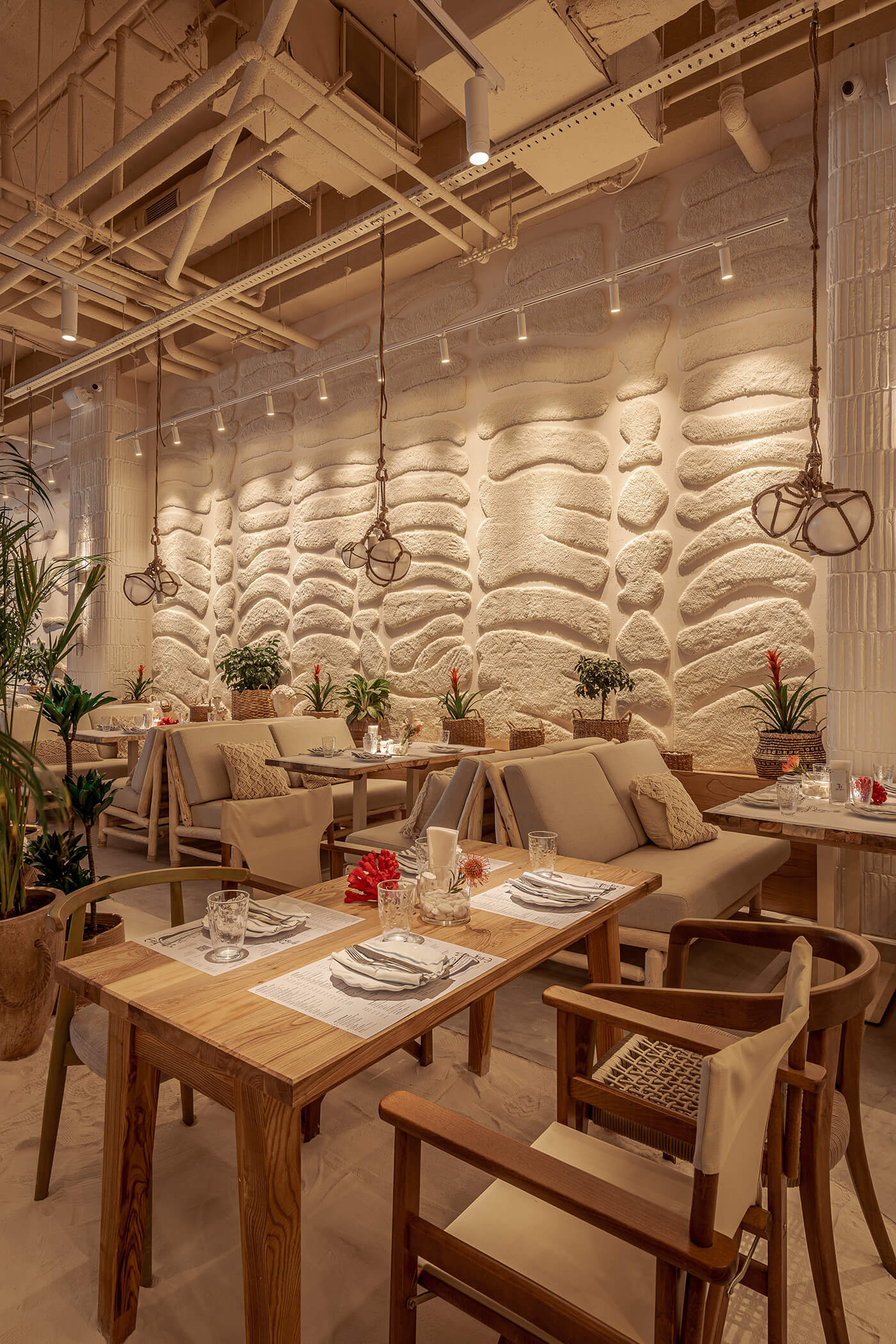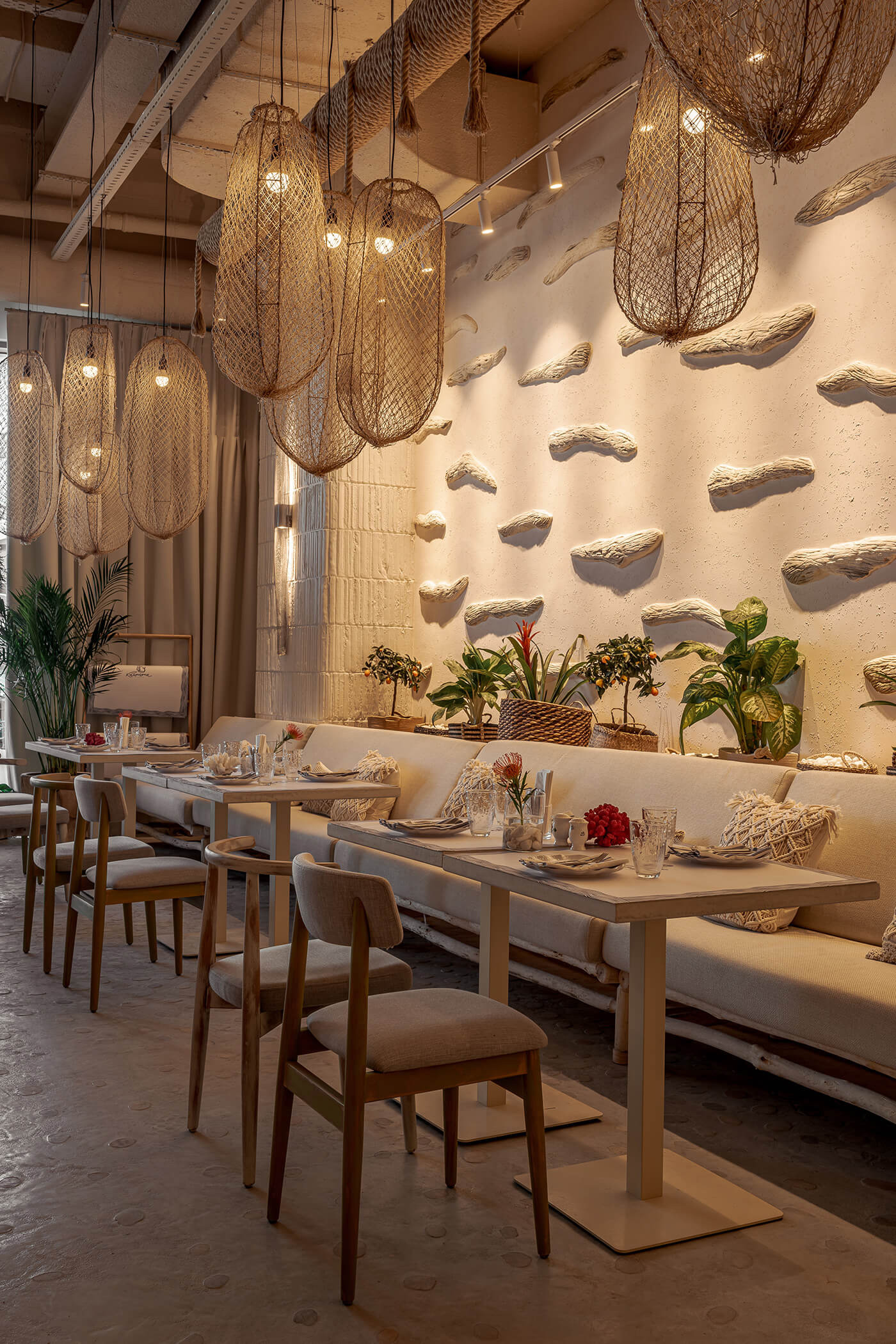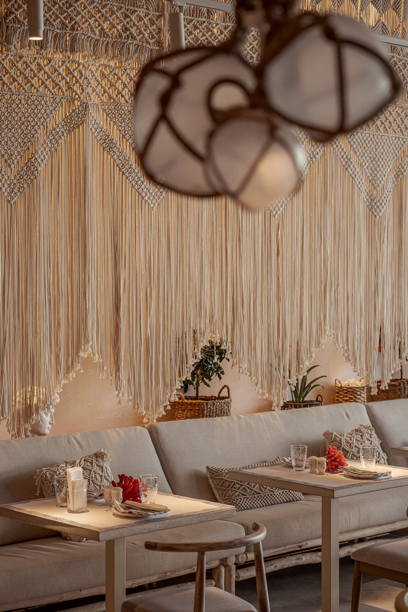 The terrace continues the restaurant’s seaside story. Here, macramé-woven umbrellas cast playful patterns of light and shadow, rattan and wooden furniture blend harmoniously with the natural palette, and white corals add refined touches.