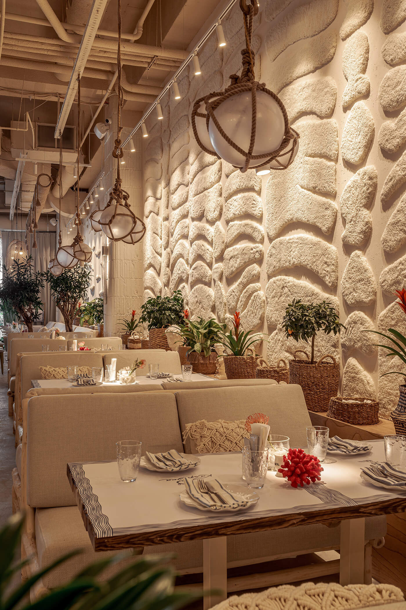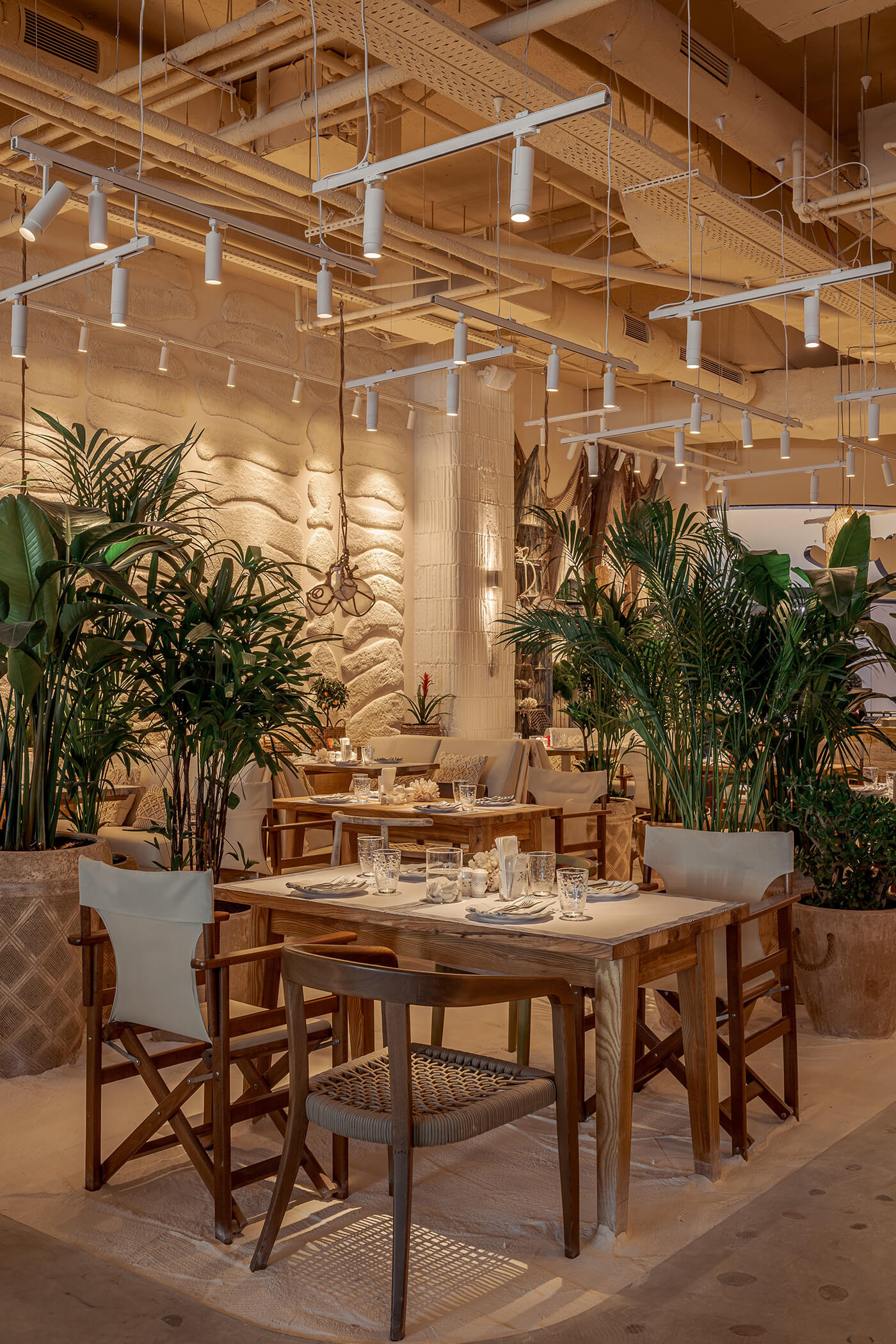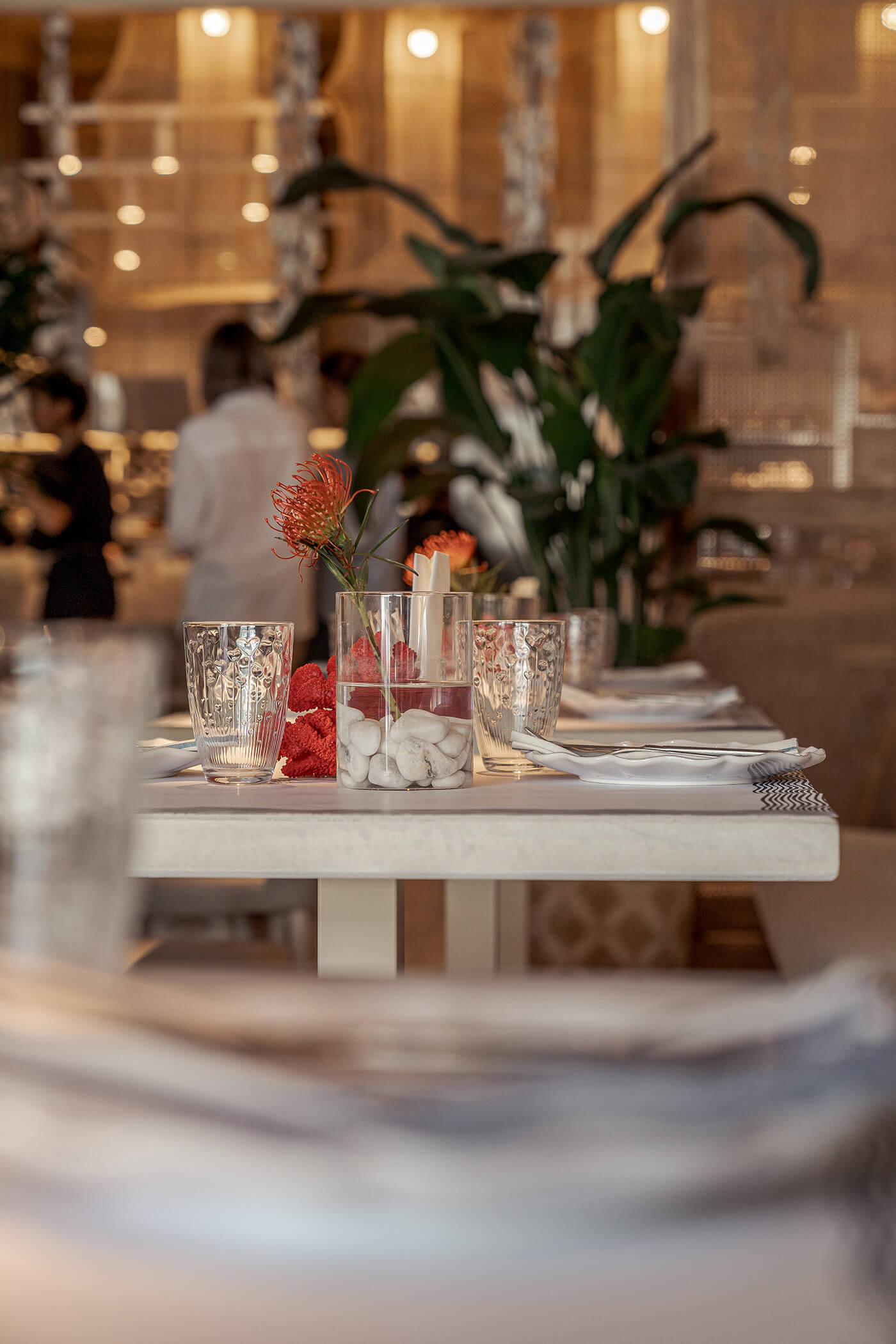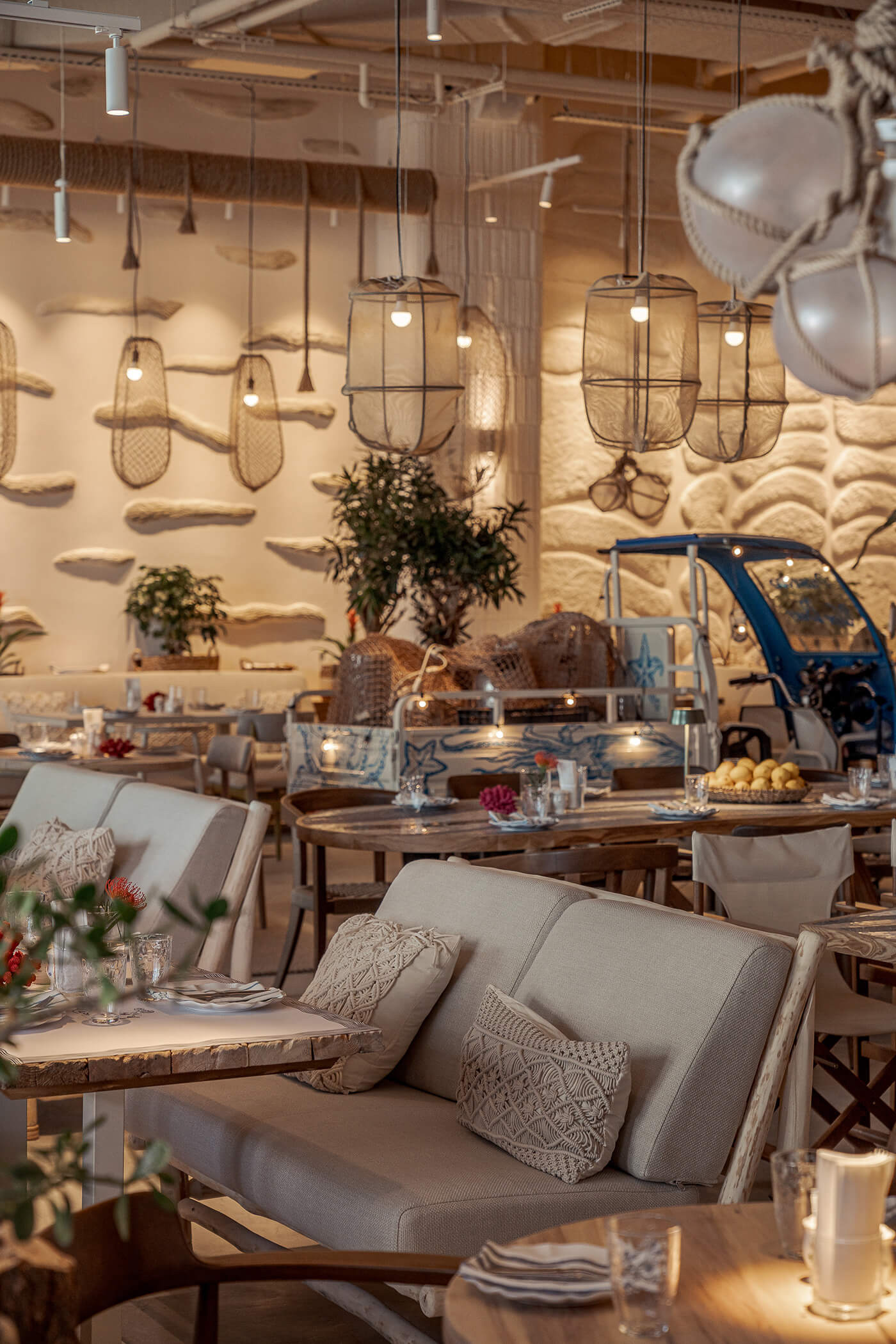 The terrace continues the restaurant’s seaside story. Here, macramé-woven umbrellas cast playful patterns of light and shadow, rattan and wooden furniture blend harmoniously with the natural palette, and white corals add refined touches.