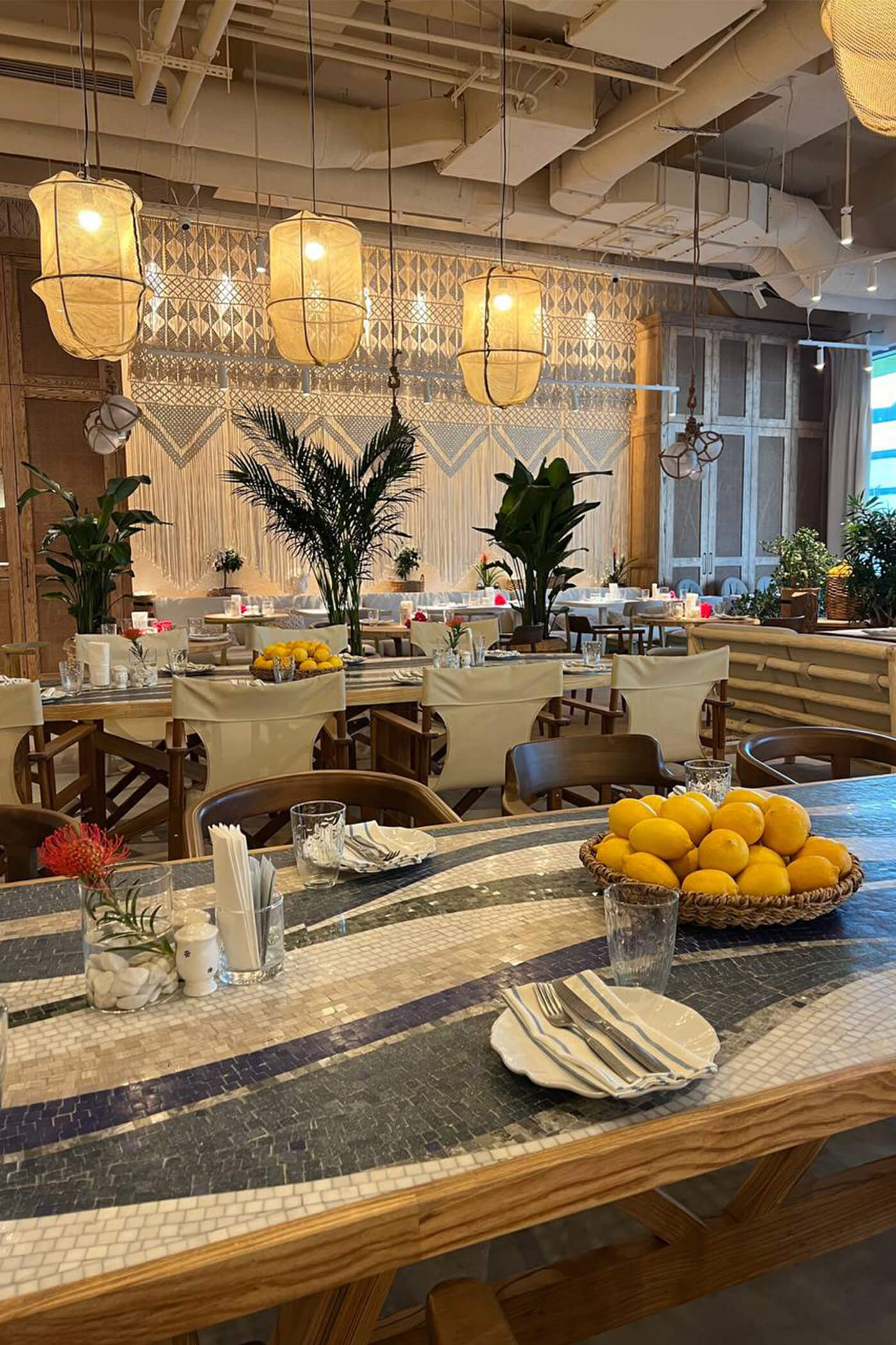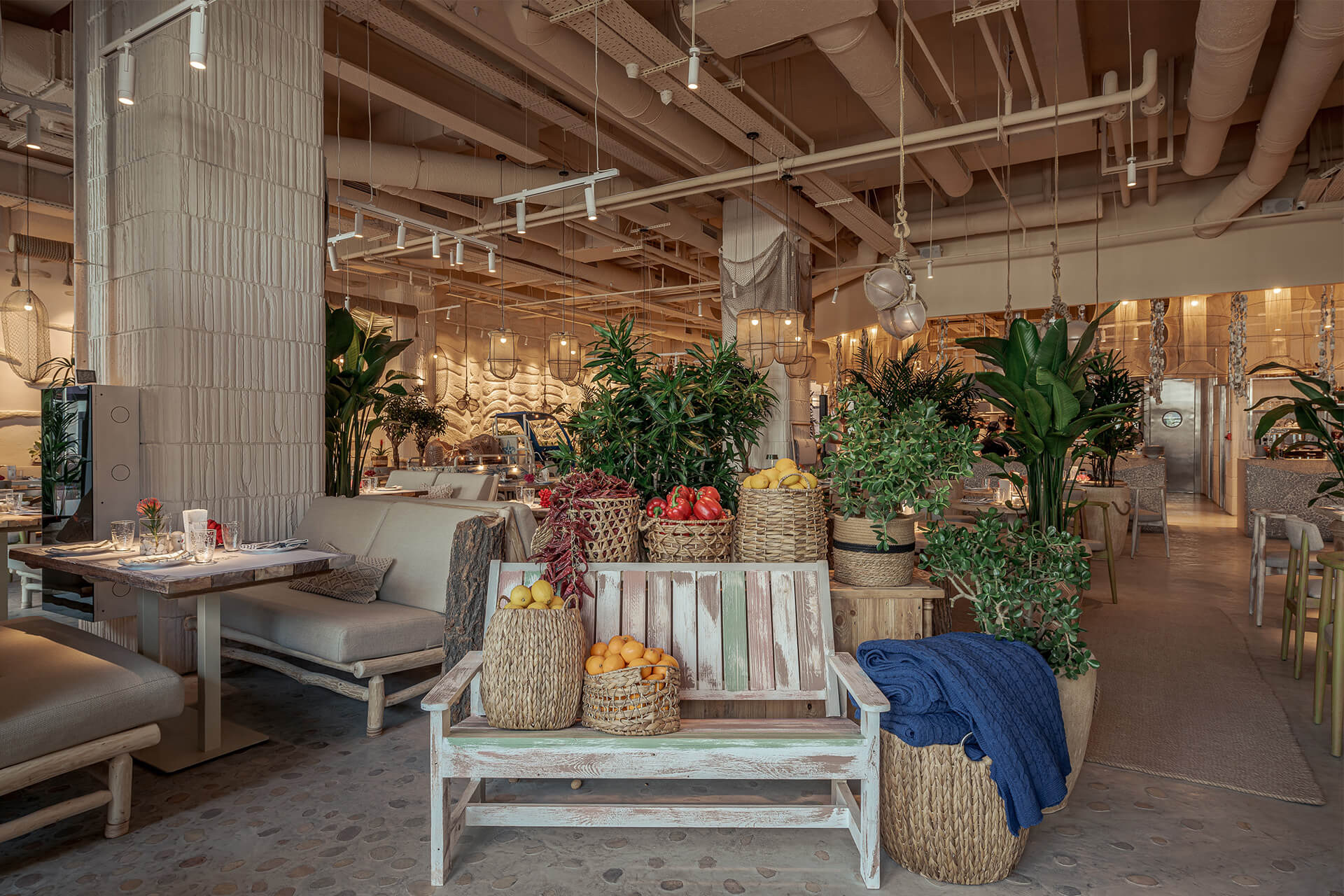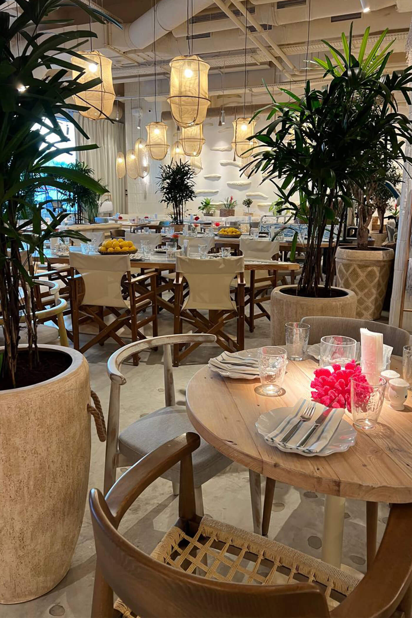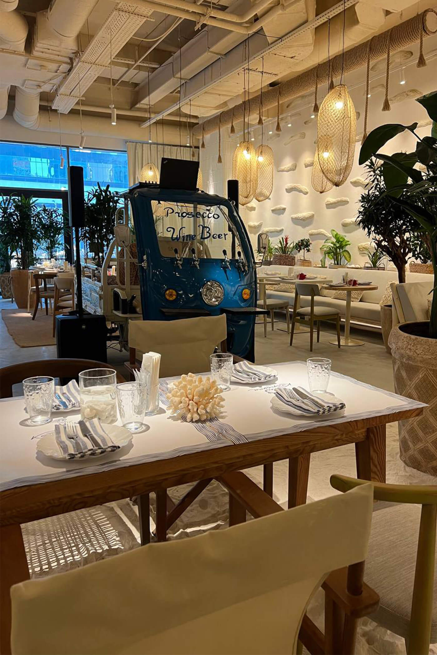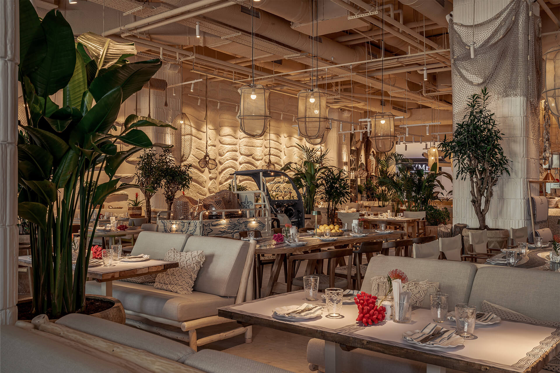 The terrace continues the restaurant’s seaside story. Here, macramé-woven umbrellas cast playful patterns of light and shadow, rattan and wooden furniture blend harmoniously with the natural palette, and white corals add refined touches.