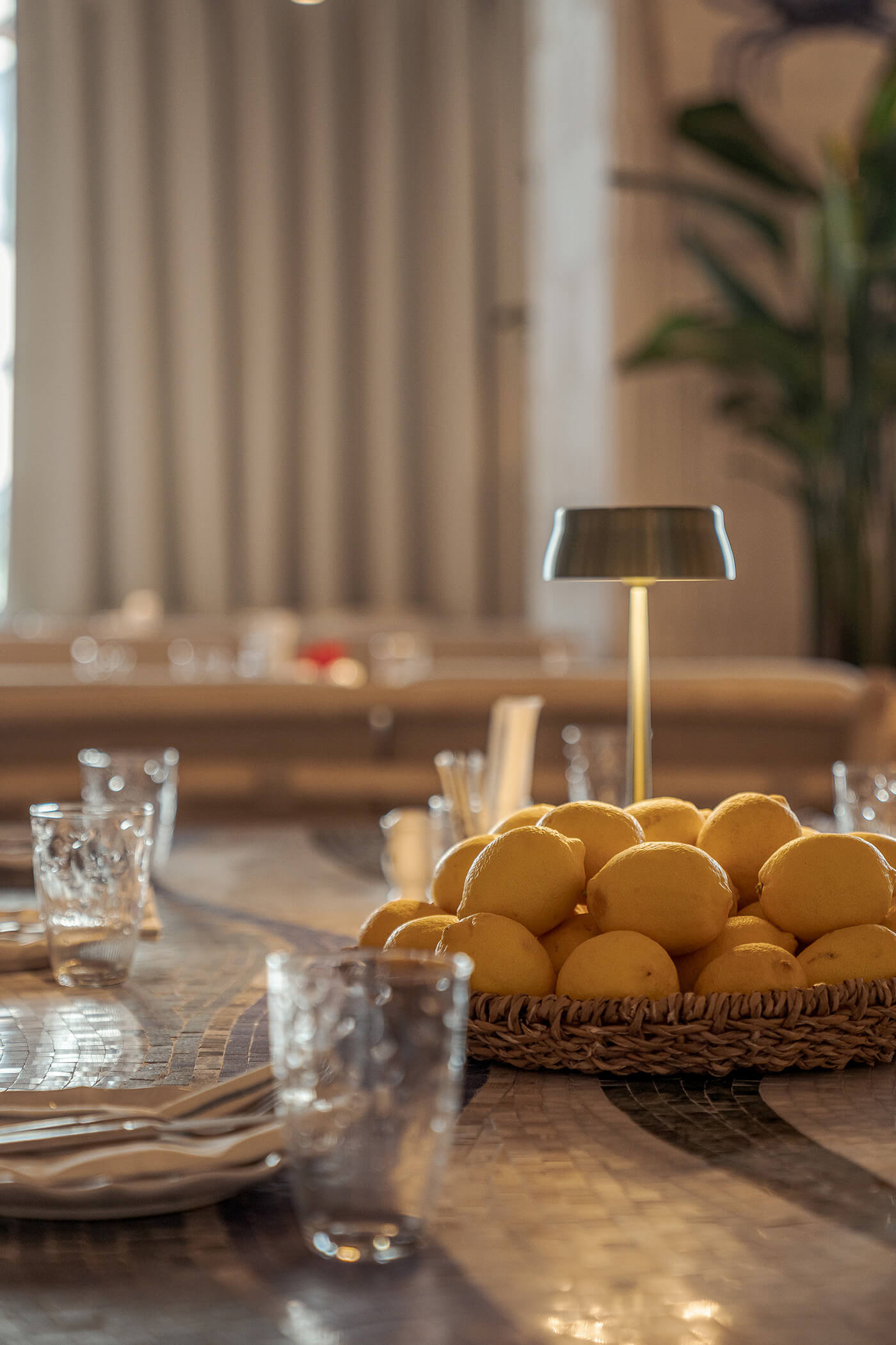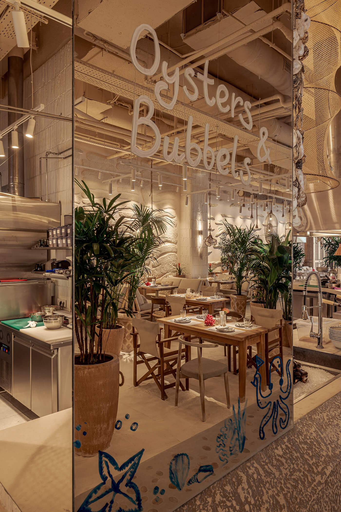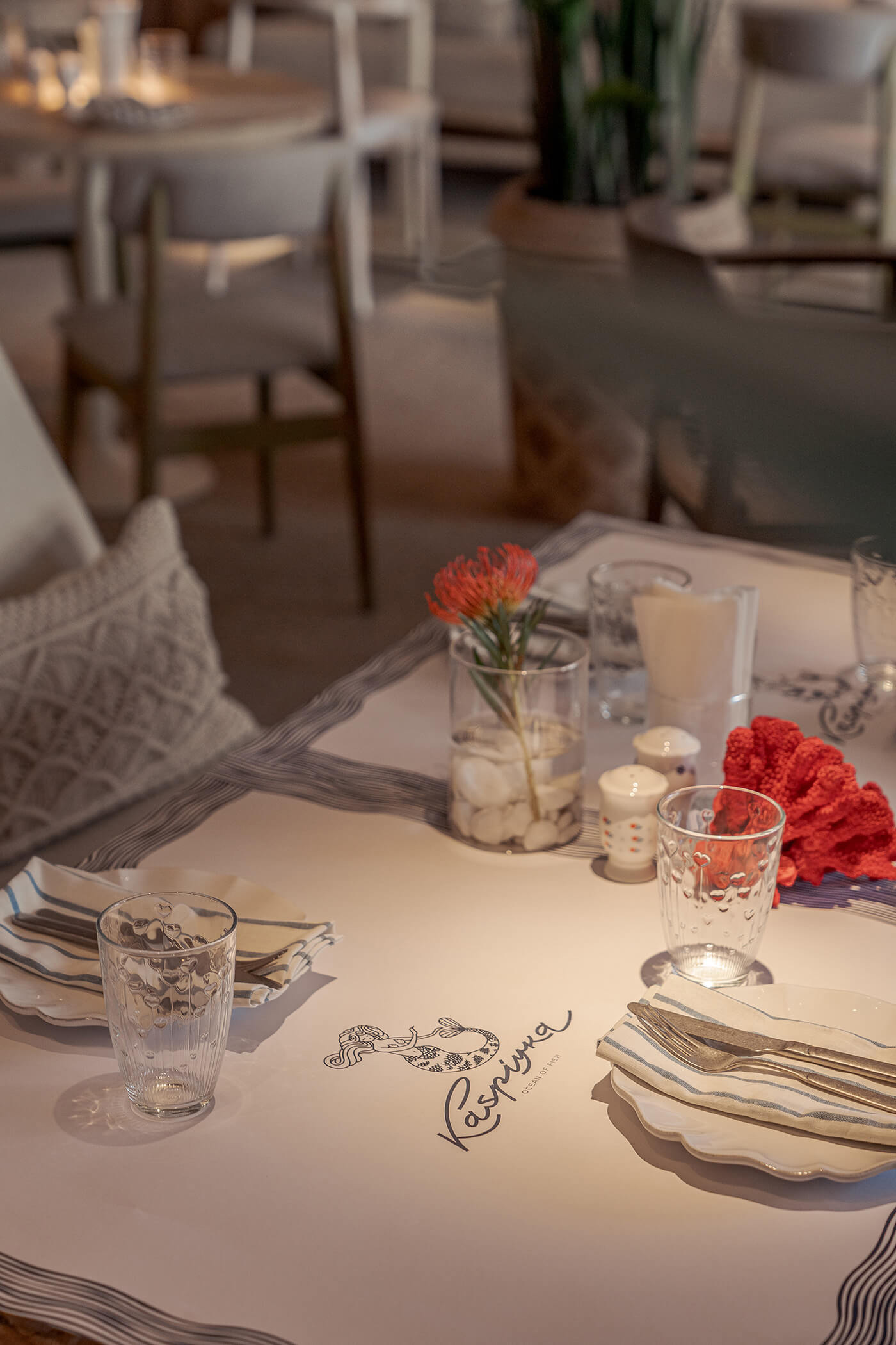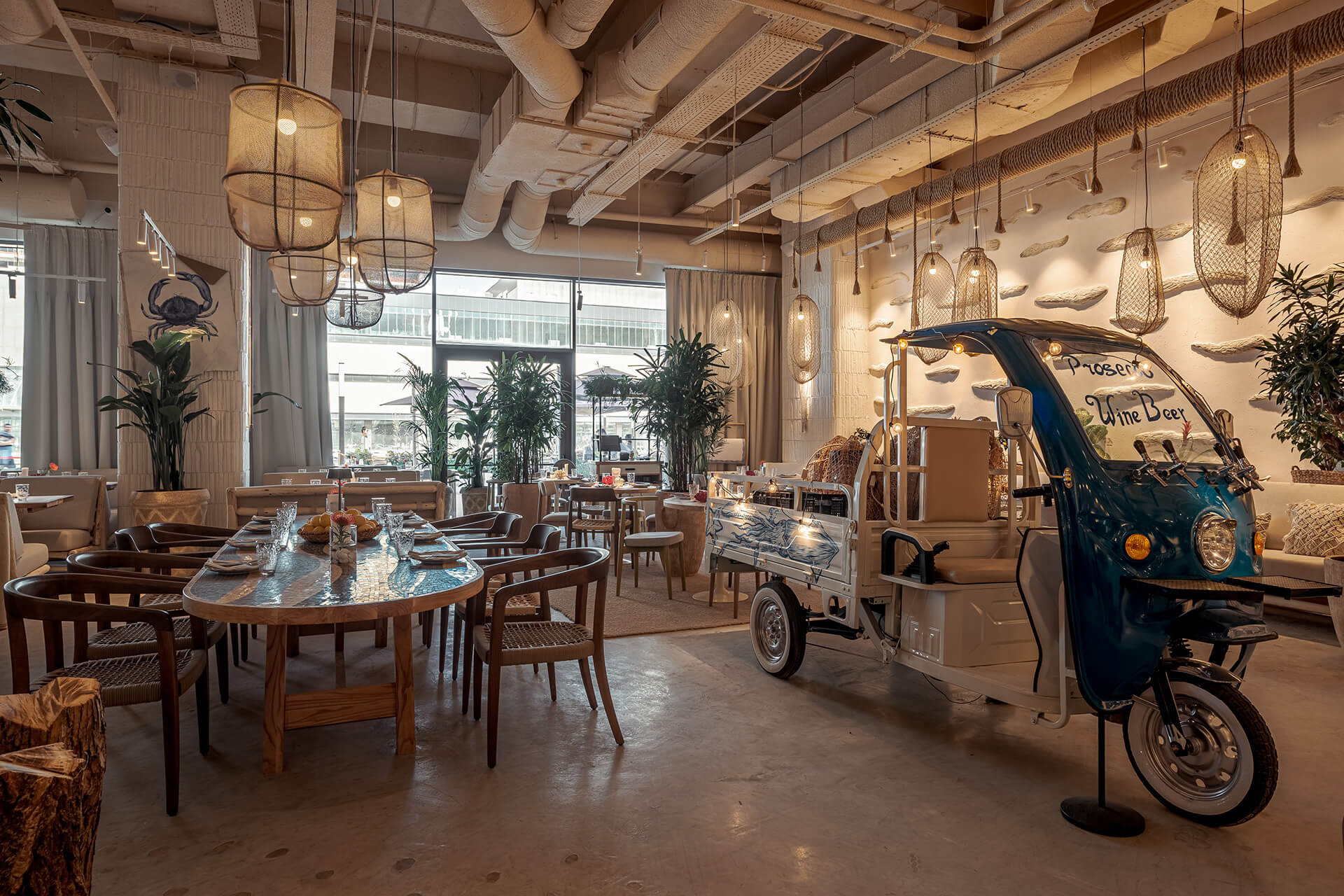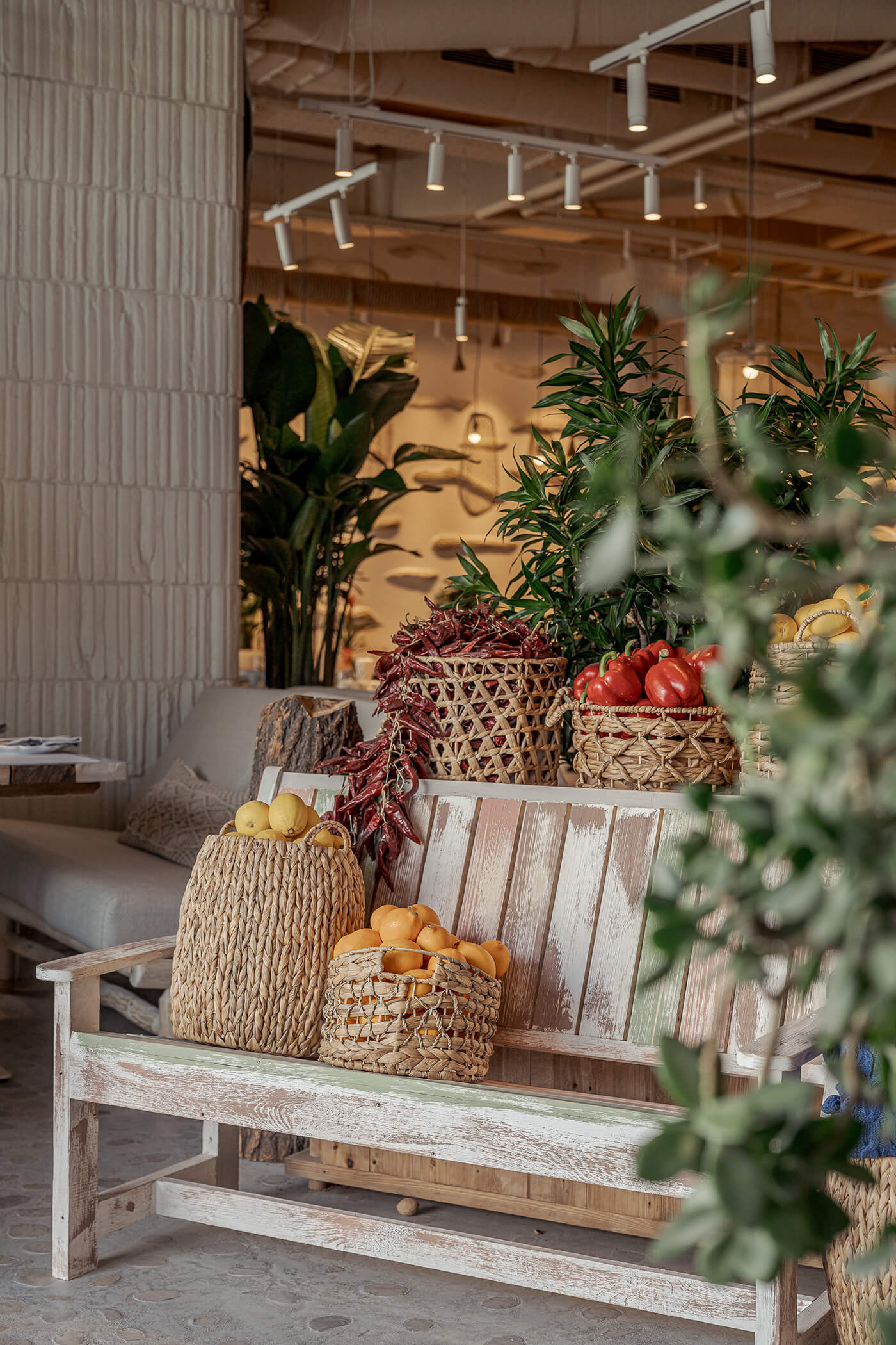 The terrace continues the restaurant’s seaside story. Here, macramé-woven umbrellas cast playful patterns of light and shadow, rattan and wooden furniture blend harmoniously with the natural palette, and white corals add refined touches.
