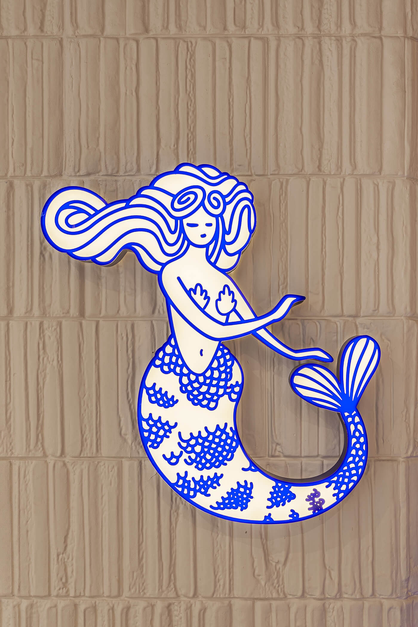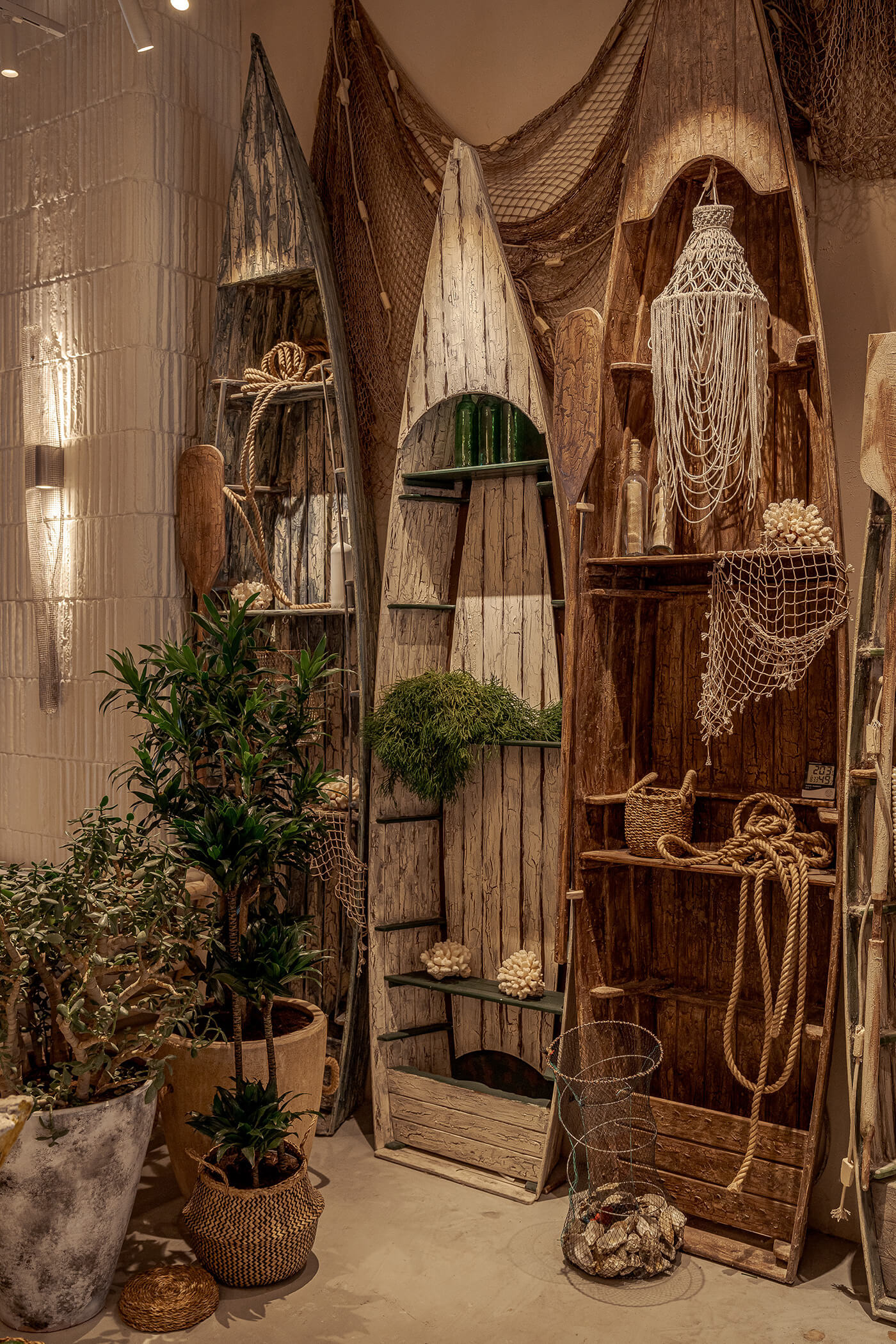 Lighting fixtures woven from fishing nets, sandy hues, natural materials, decorative boats, and mermaid sculptures create an atmosphere of natural beauty and comfort, while lush greenery enhances the sense of relaxation and closeness to nature.