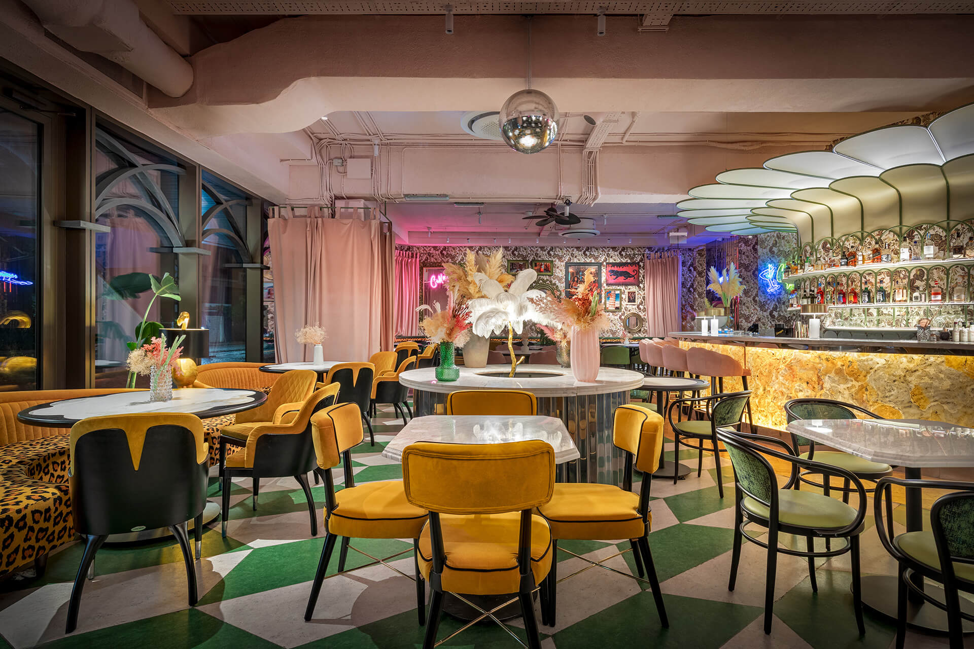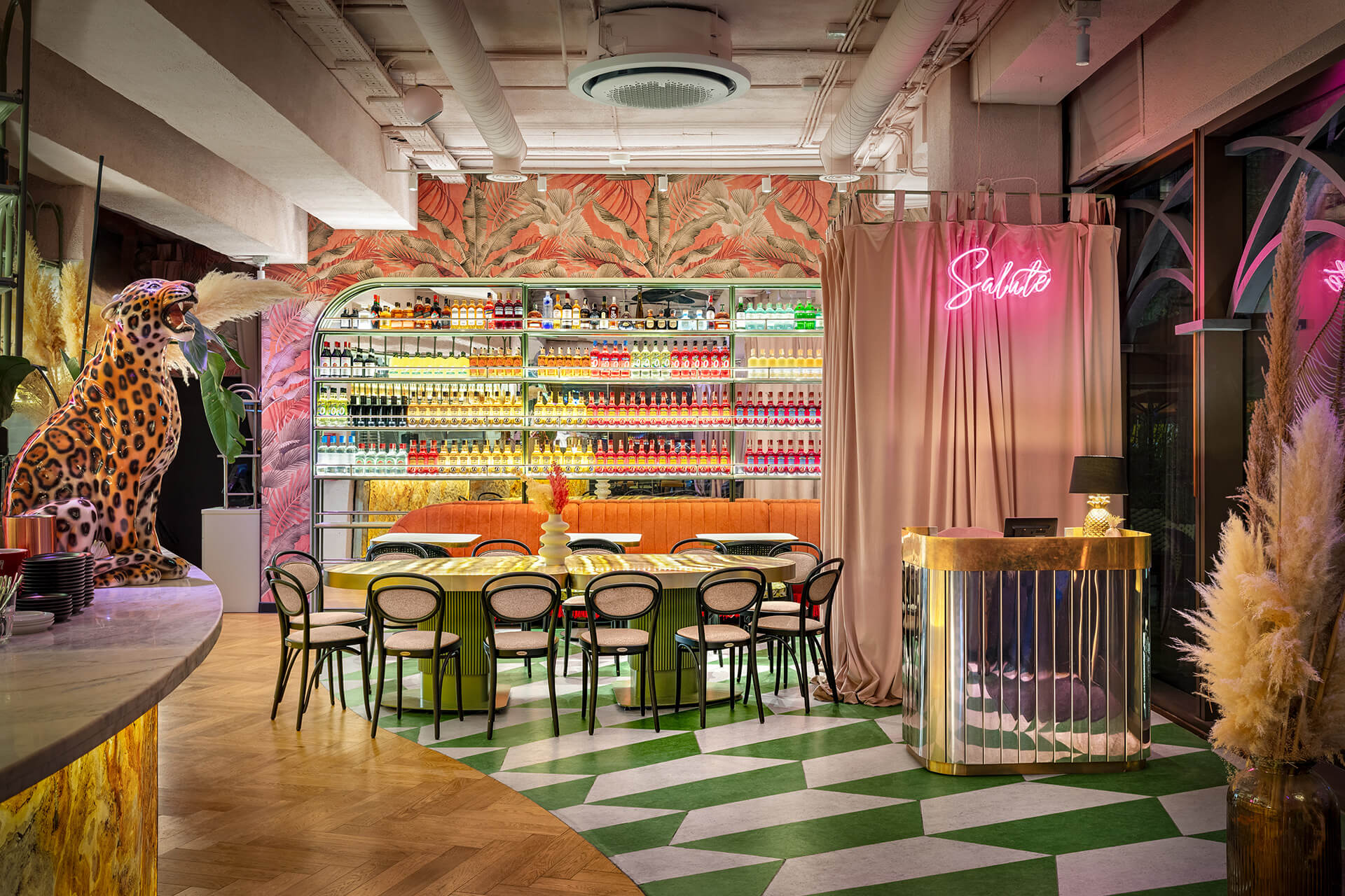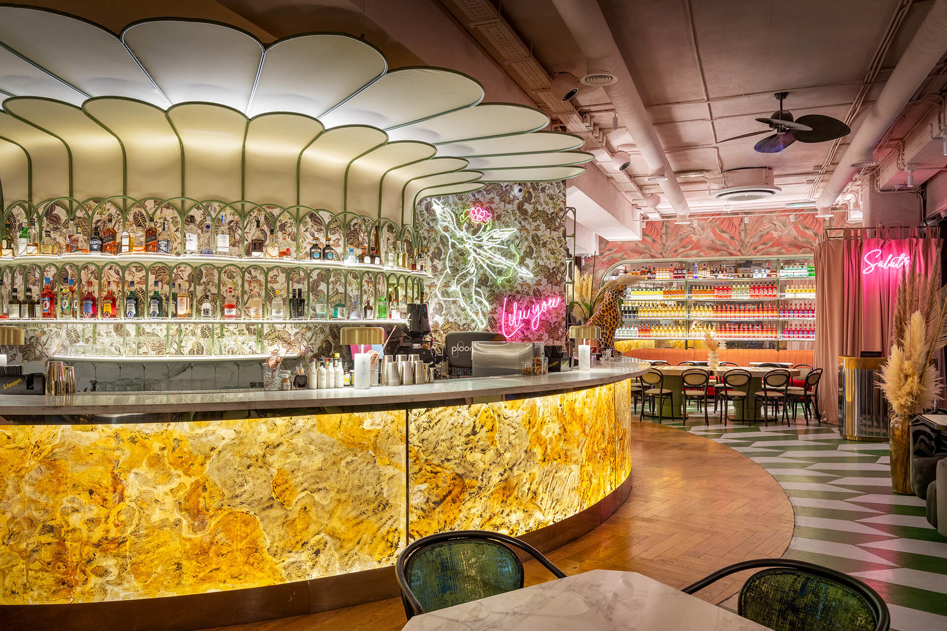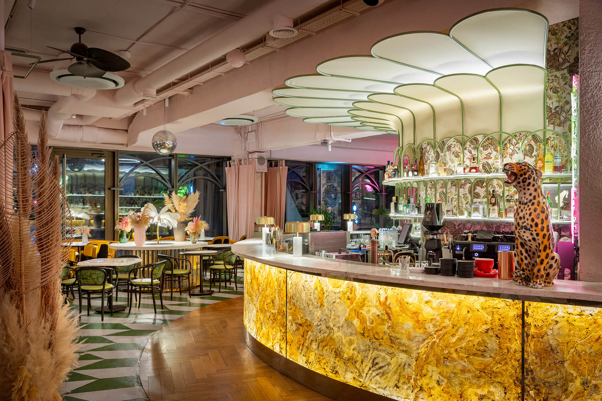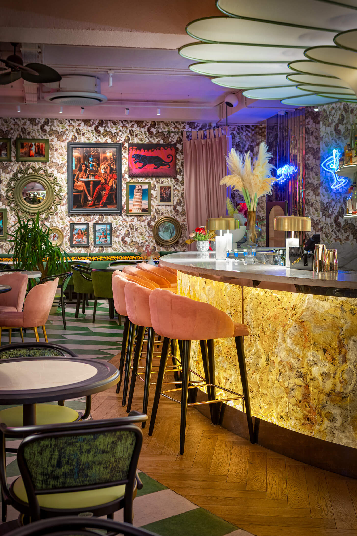 The eclectic design blends whimsical luxury with a touch of playful charm. A leopard print, created exclusively for the upholstery in this project, feels futuristic and fresh, avoiding any literal interpretation. One of the project’s notable achievements was integrating the existing curved bar counter into the new design. It is now complemented by a glowing onyx wall and crowned with an Art Nouveau–style canopy.
