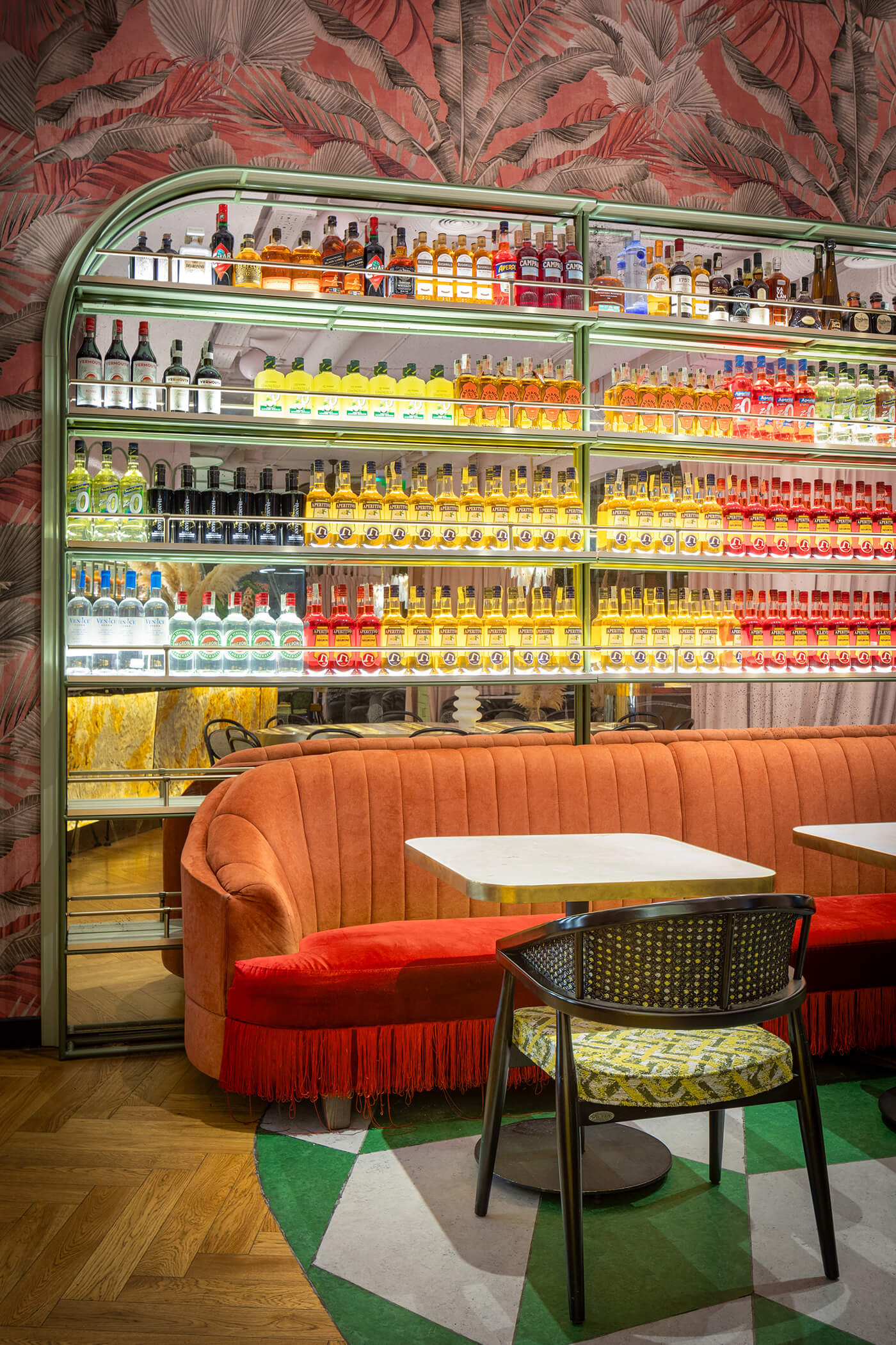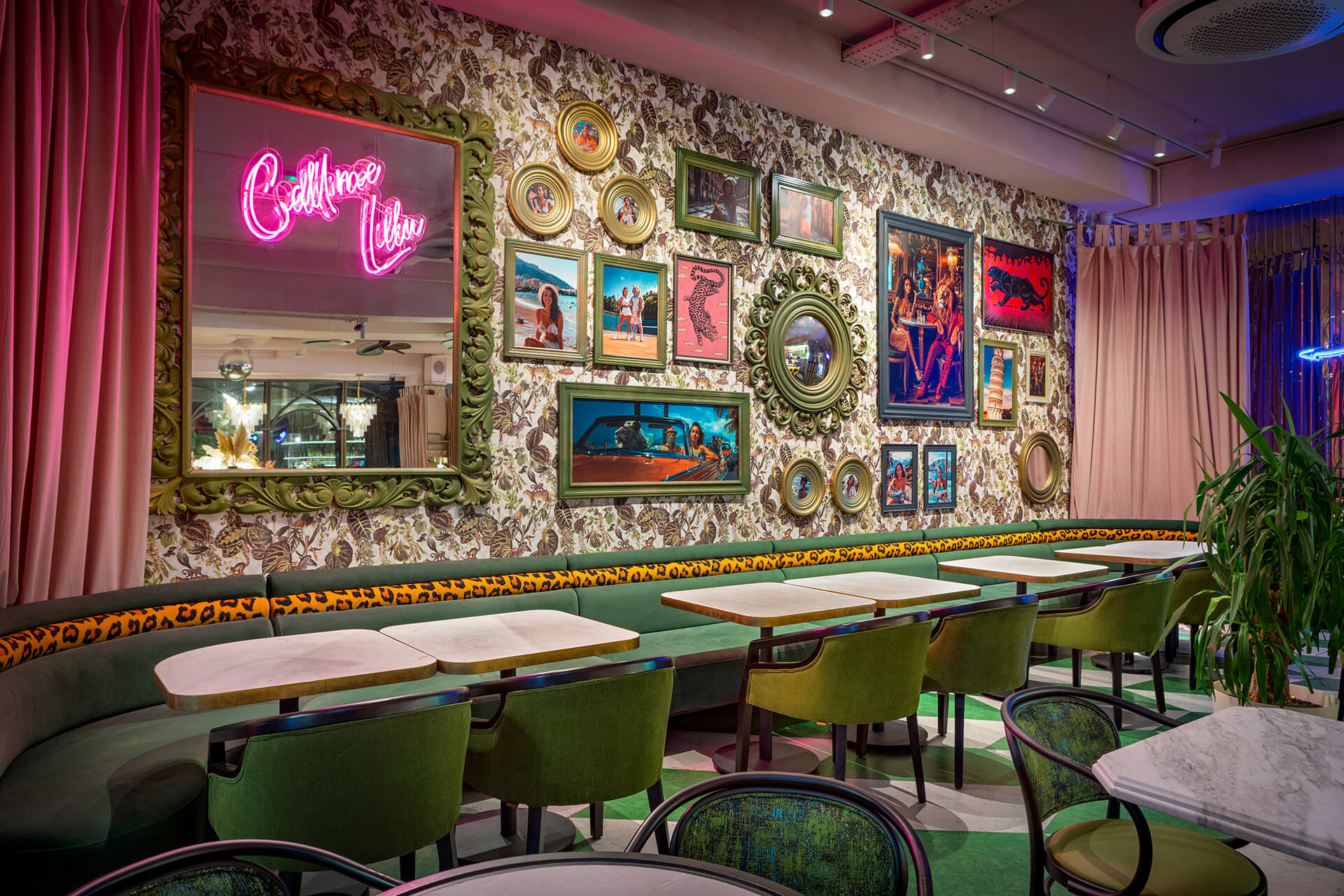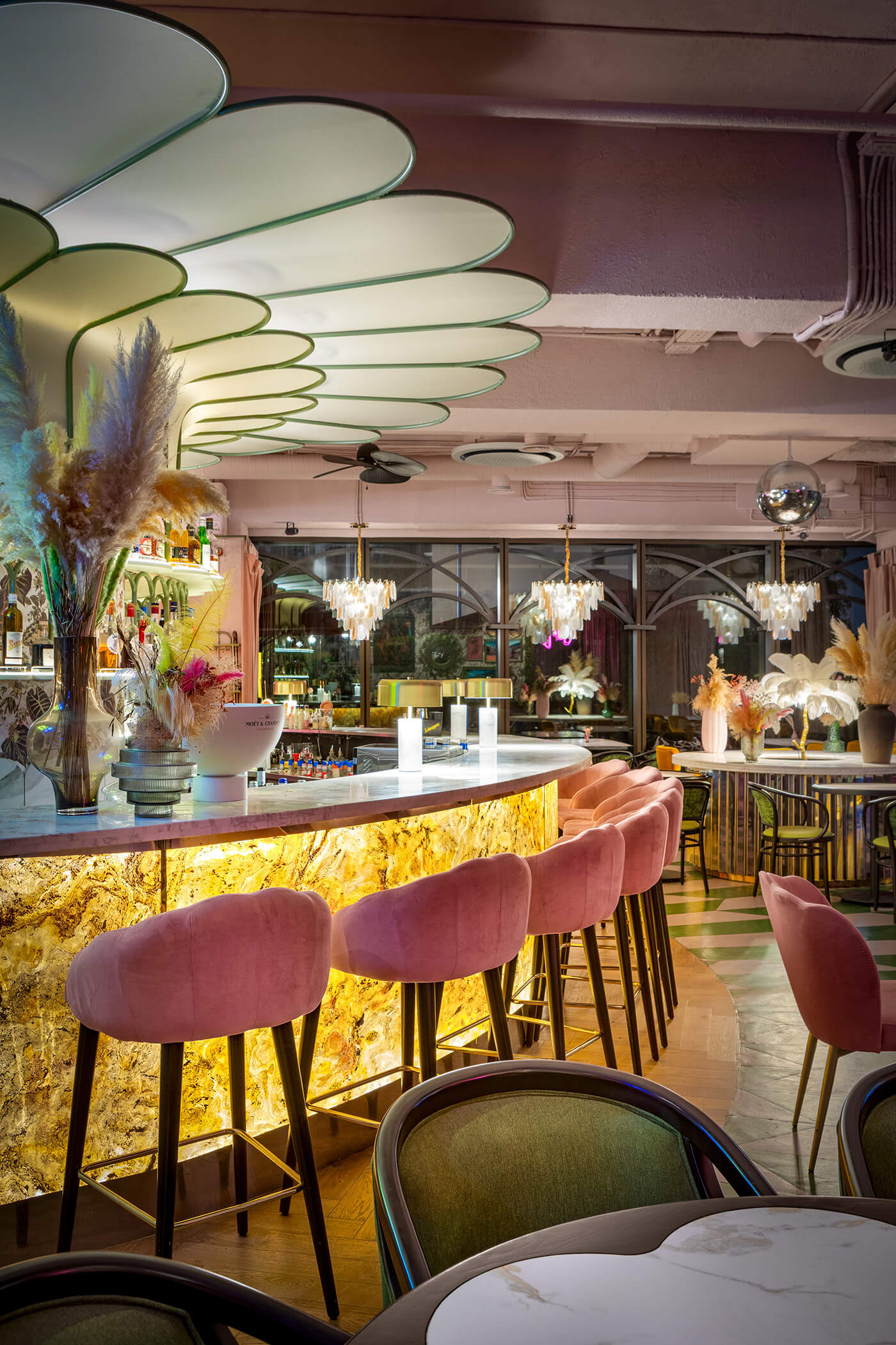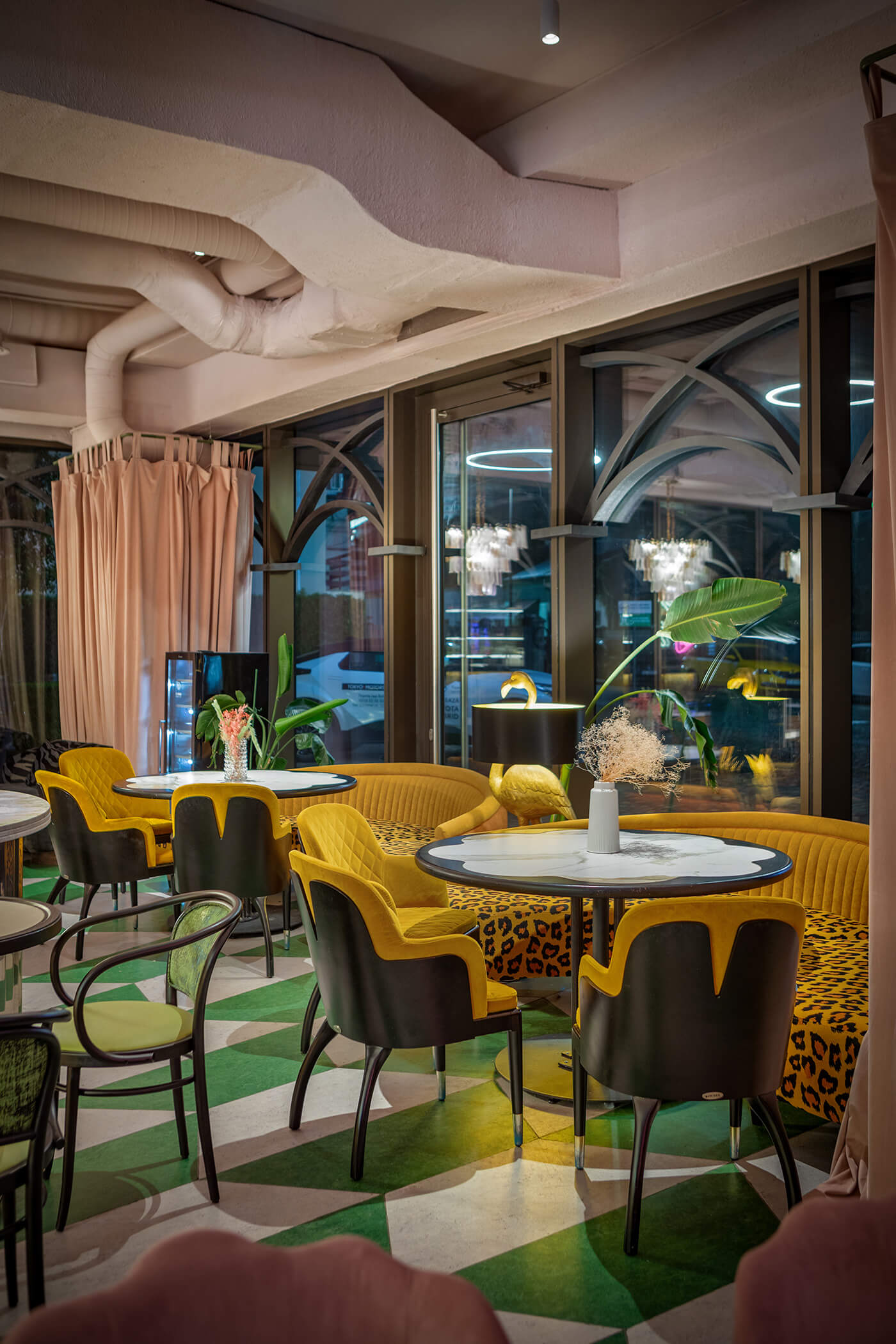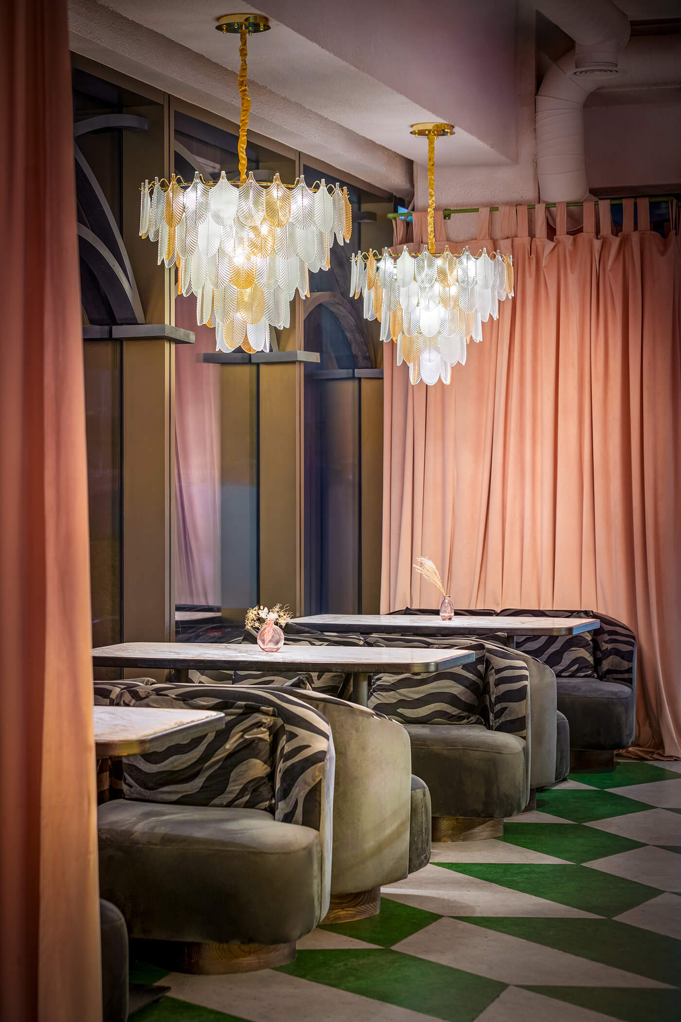 The eclectic design blends whimsical luxury with a touch of playful charm. A leopard print, created exclusively for the upholstery in this project, feels futuristic and fresh, avoiding any literal interpretation. One of the project’s notable achievements was integrating the existing curved bar counter into the new design. It is now complemented by a glowing onyx wall and crowned with an Art Nouveau–style canopy.