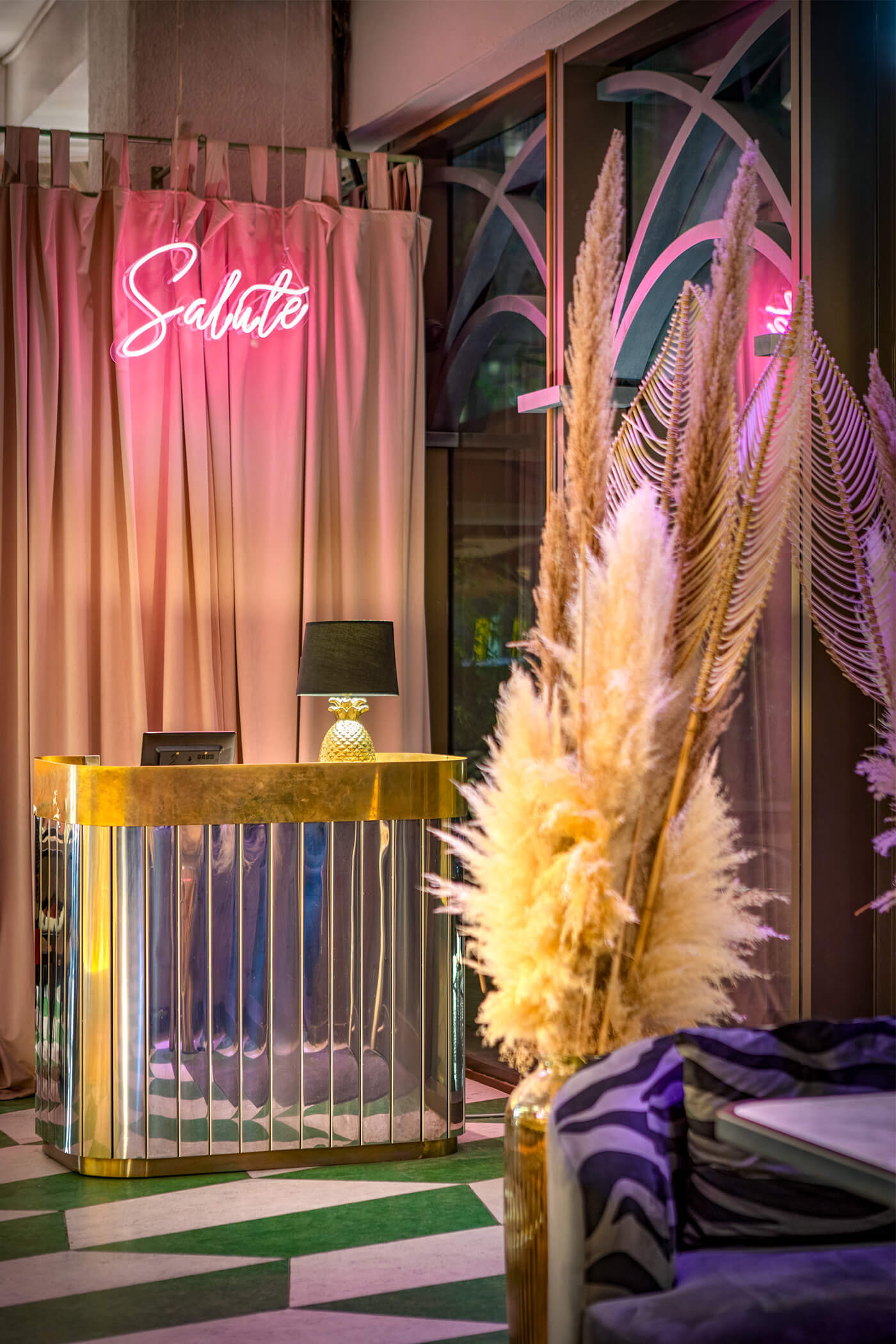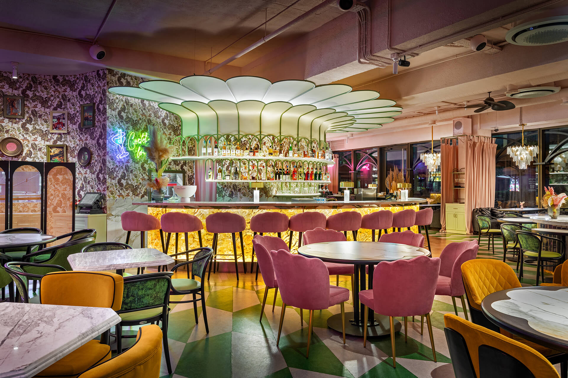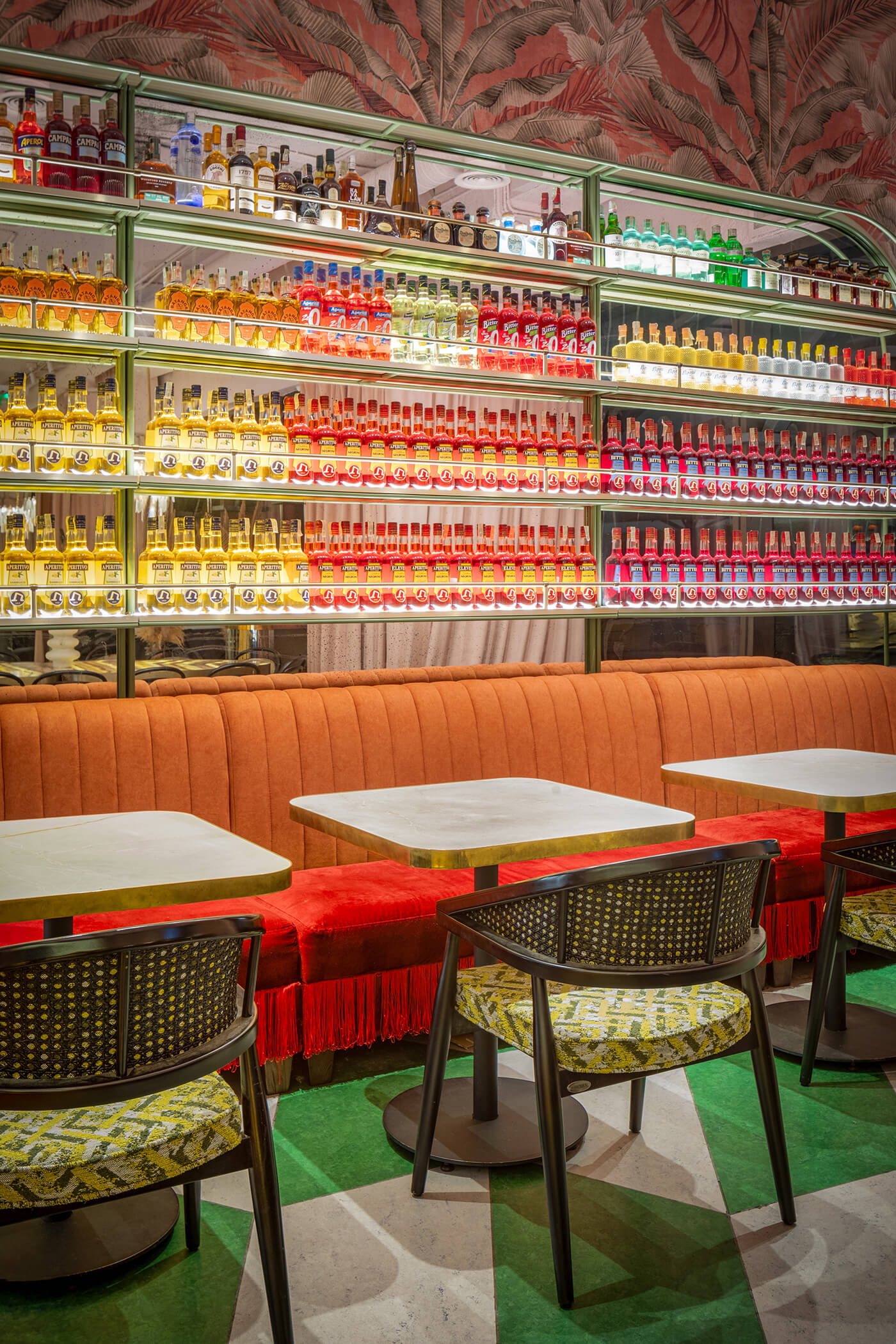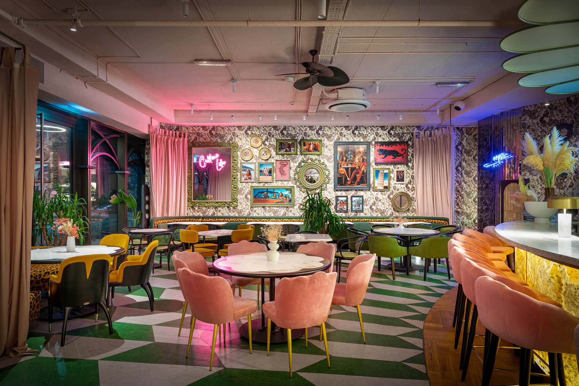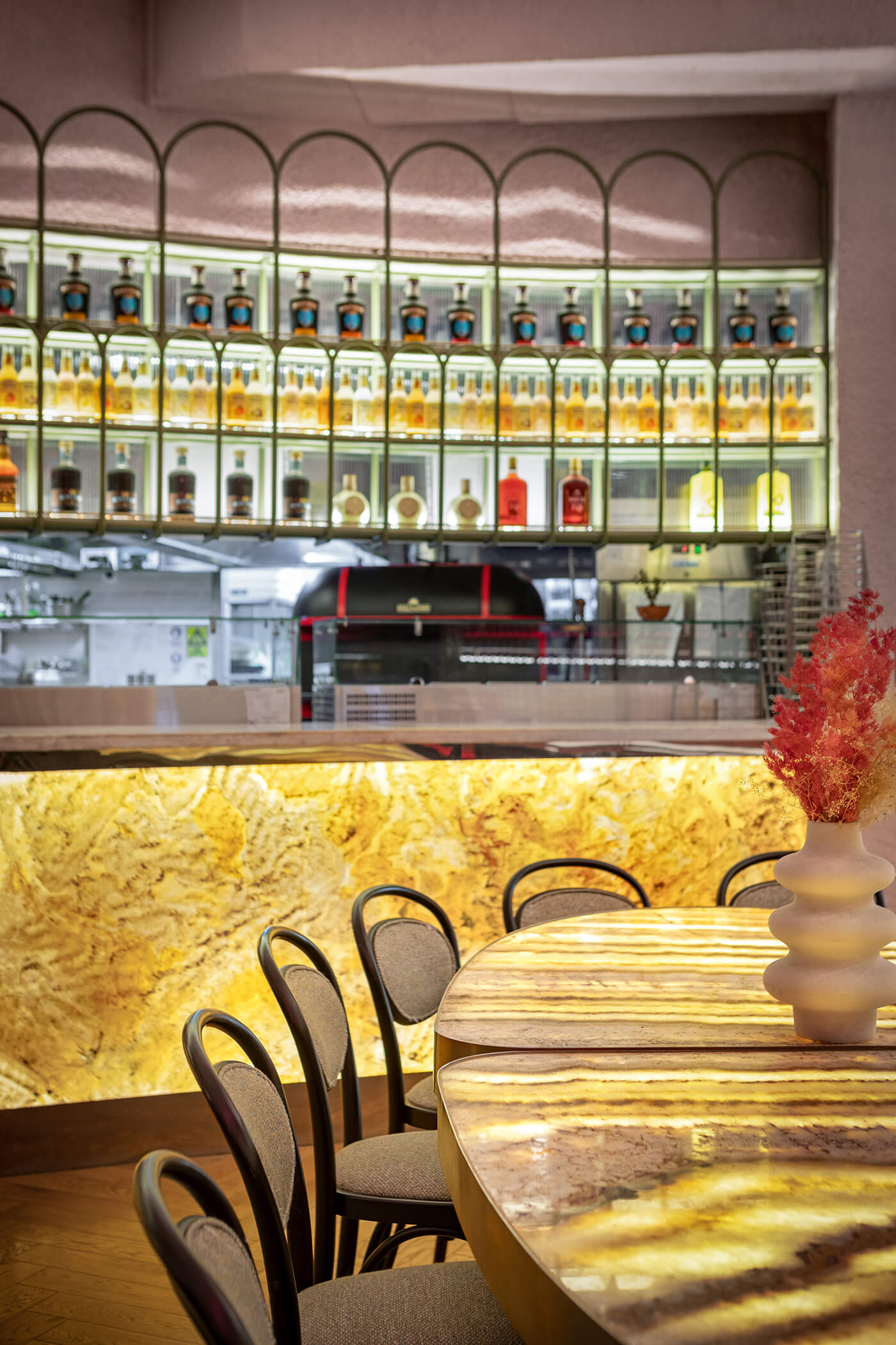 The eclectic design blends whimsical luxury with a touch of playful charm. A leopard print, created exclusively for the upholstery in this project, feels futuristic and fresh, avoiding any literal interpretation. One of the project’s notable achievements was integrating the existing curved bar counter into the new design. It is now complemented by a glowing onyx wall and crowned with an Art Nouveau–style canopy.