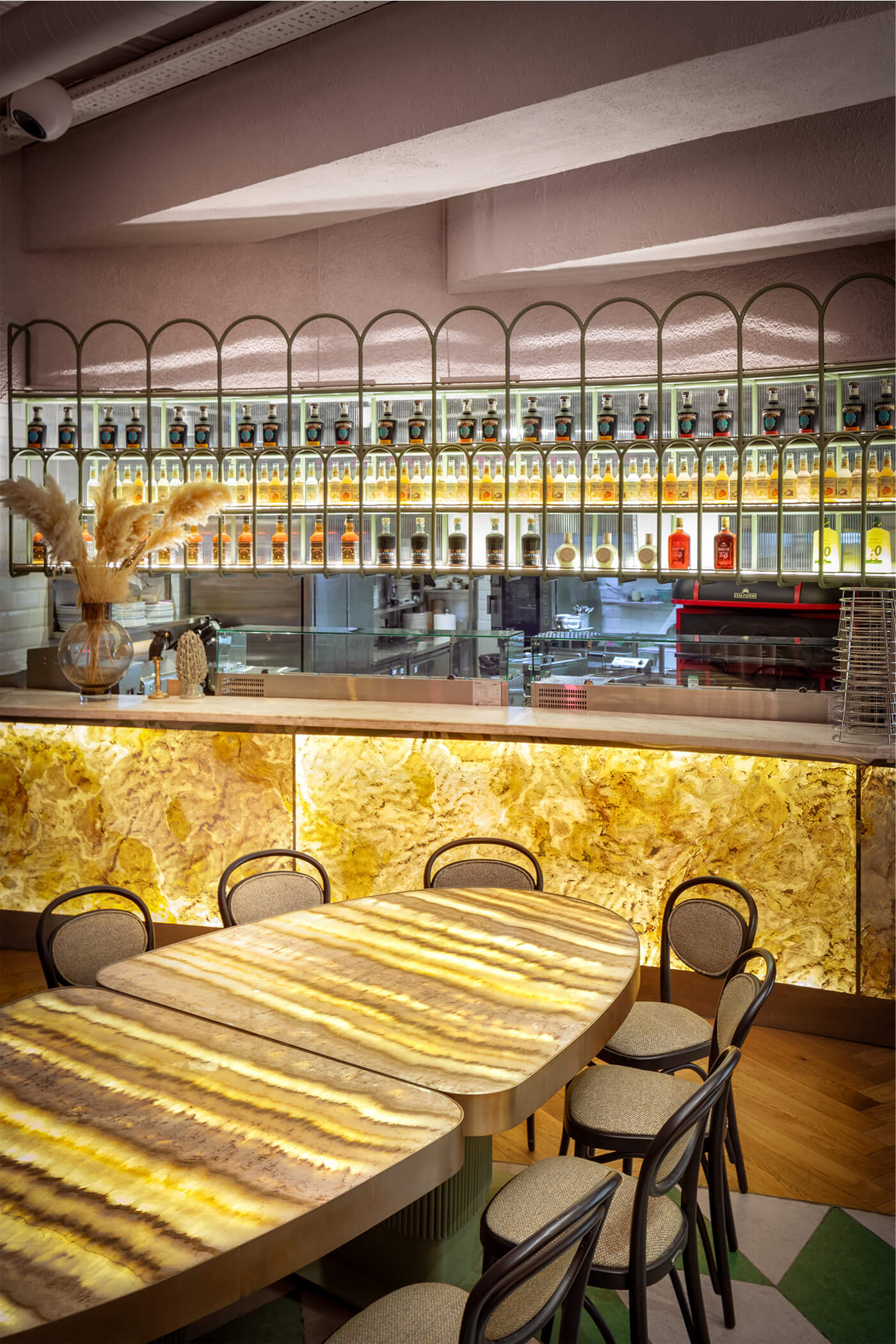 Panoramic windows are adorned with elegant geometric elements, also in the Art Nouveau style. This not only enhances the building’s exterior appeal but also reinforces the restaurant’s character inside. The intricate floor geometry adds a sense of movement, while the statement wall — decorated with mirrors, foliage, and artwork — transforms the dining area into an atmospheric art space. An open kitchen plays a key role in the concept, filling the restaurant with life and engaging guests in the process of creating dishes.