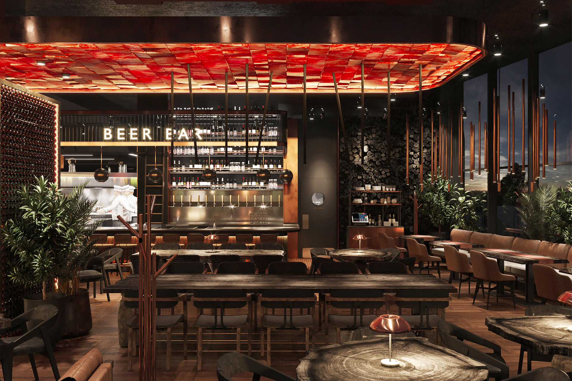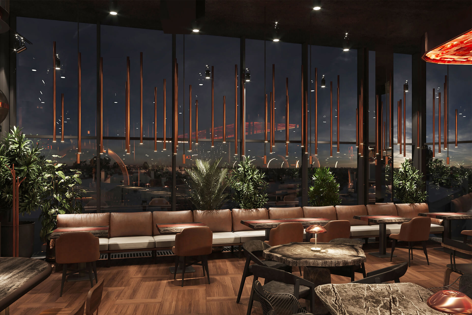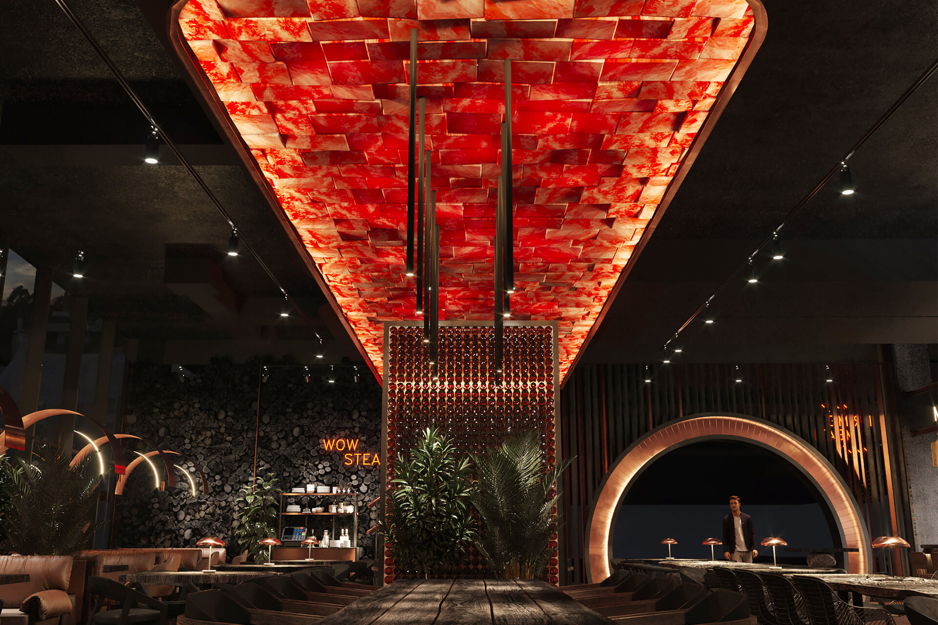 Himalayan salt panels with red backlighting on the walls and ceiling create a dramatic, volcanic glow that defines the interior’s atmosphere. Panoramic windows open up striking city views, adding warmth and an inviting evening mood to the space.