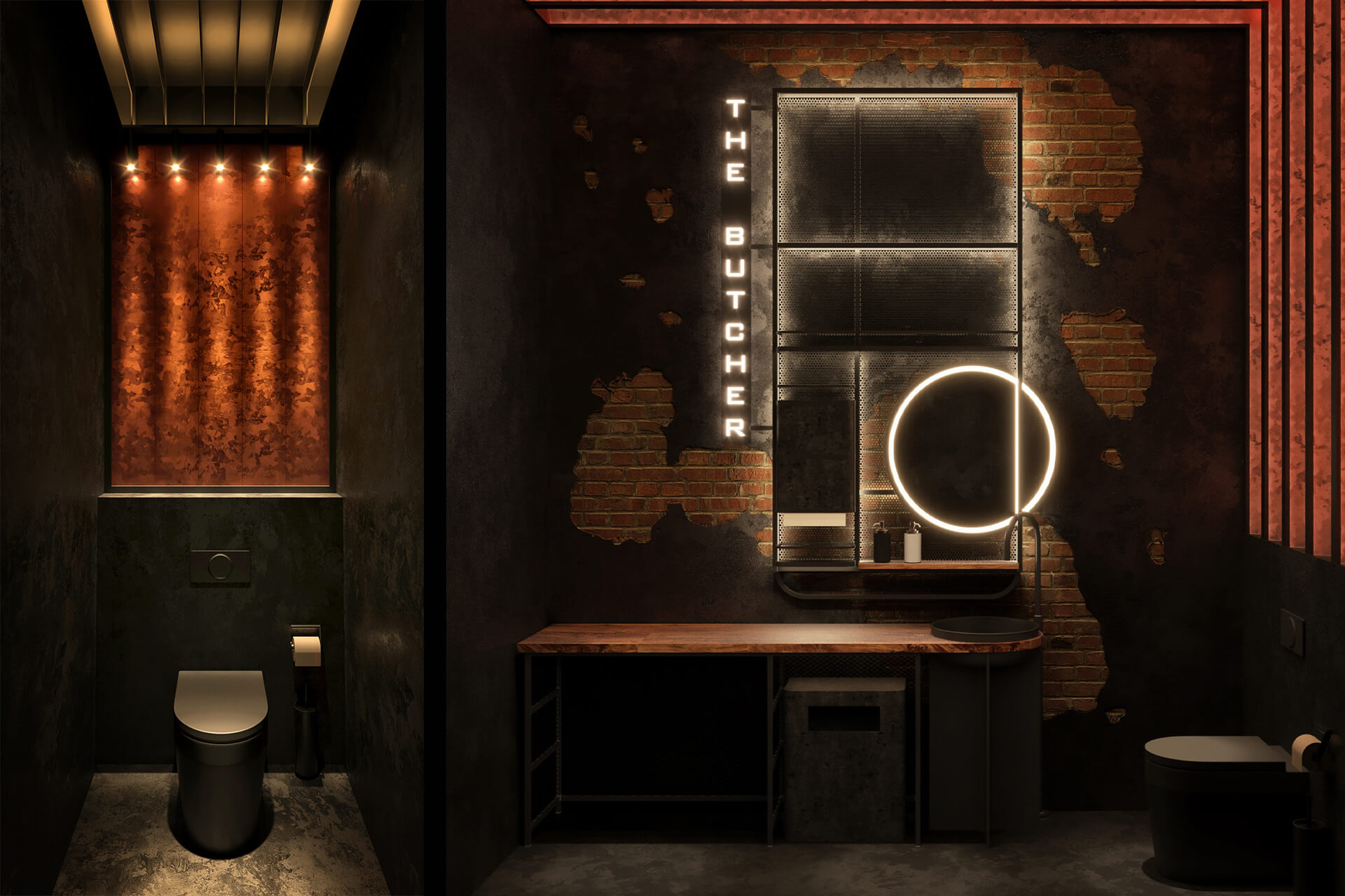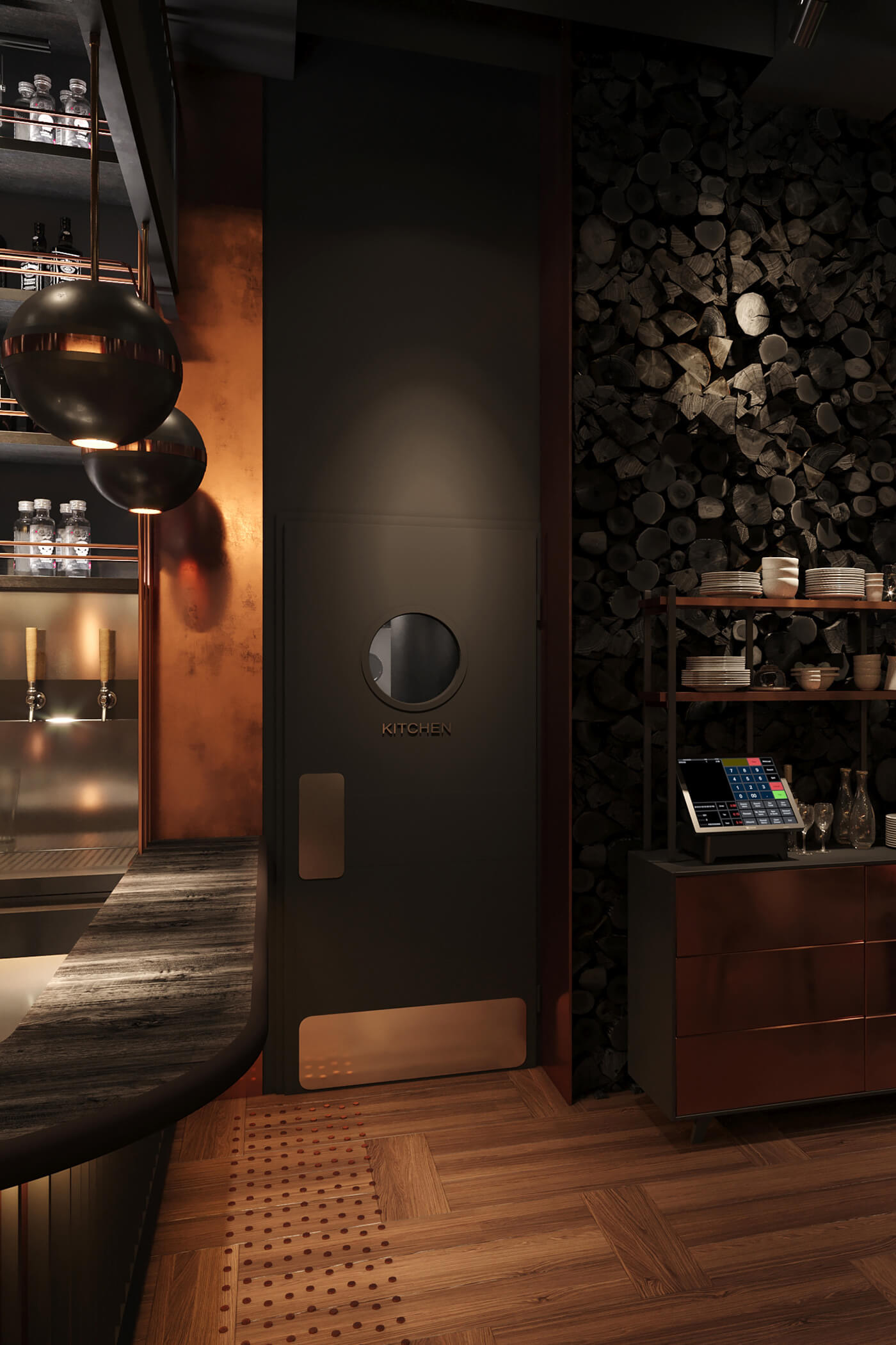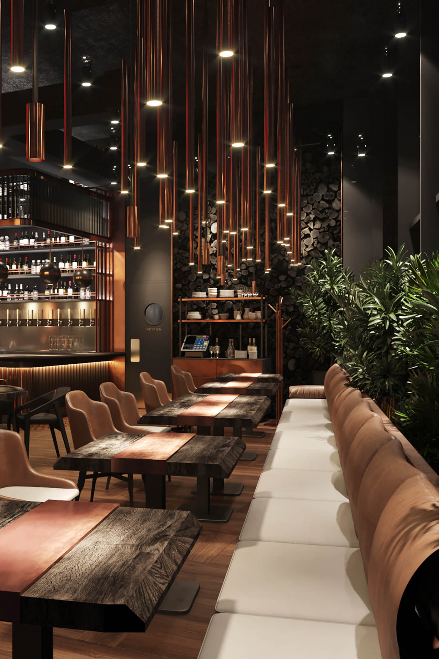 A modern meat restaurant where dishes are cooked over open fire and served without cutlery. The space evokes a sense of primal authenticity through its strict, minimalist design. Dark tones combined with raw leather textures reinforce the conceptual clarity of the project. Tables are finished with charred wood slabs and natural shale stone, emphasizing rough, tactile surfaces.