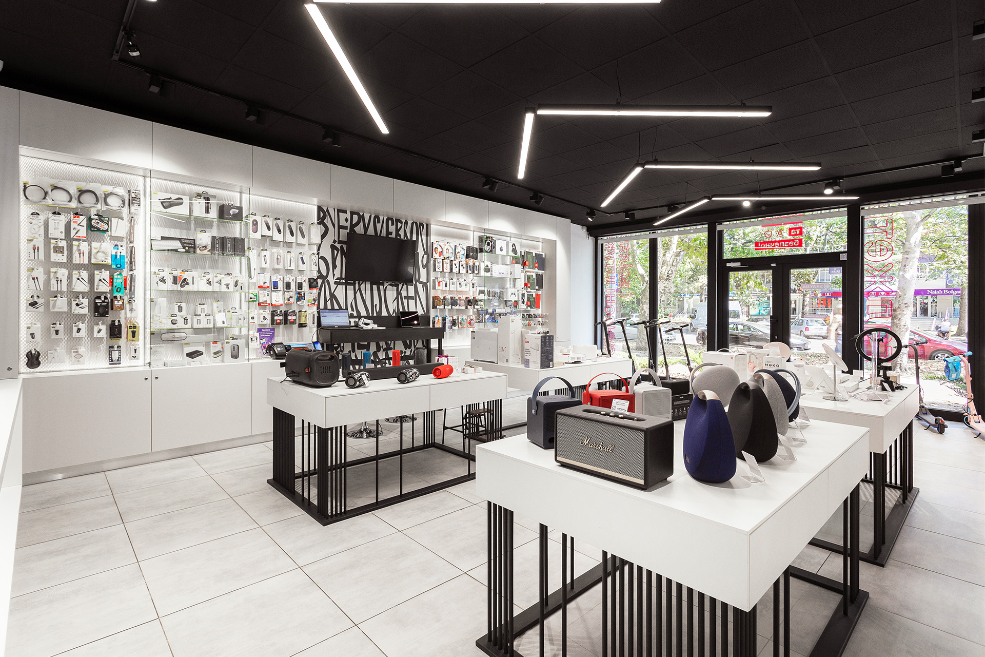«SKAY» is a modern Ukrainian company, which sells gadgets and accessories in Odesa. The interior is completed in graceful and restrained «black white» style and thanks to this a more harmonious atmosphere is kept in the store, which allows the customers pay more attention to the goods, rather than the inlay. In the cash register area, the emphasis is a metal mesh portal, which is also used in outstanding exhibition shelves with goods, highlighting names of the brands and concisely separating them.