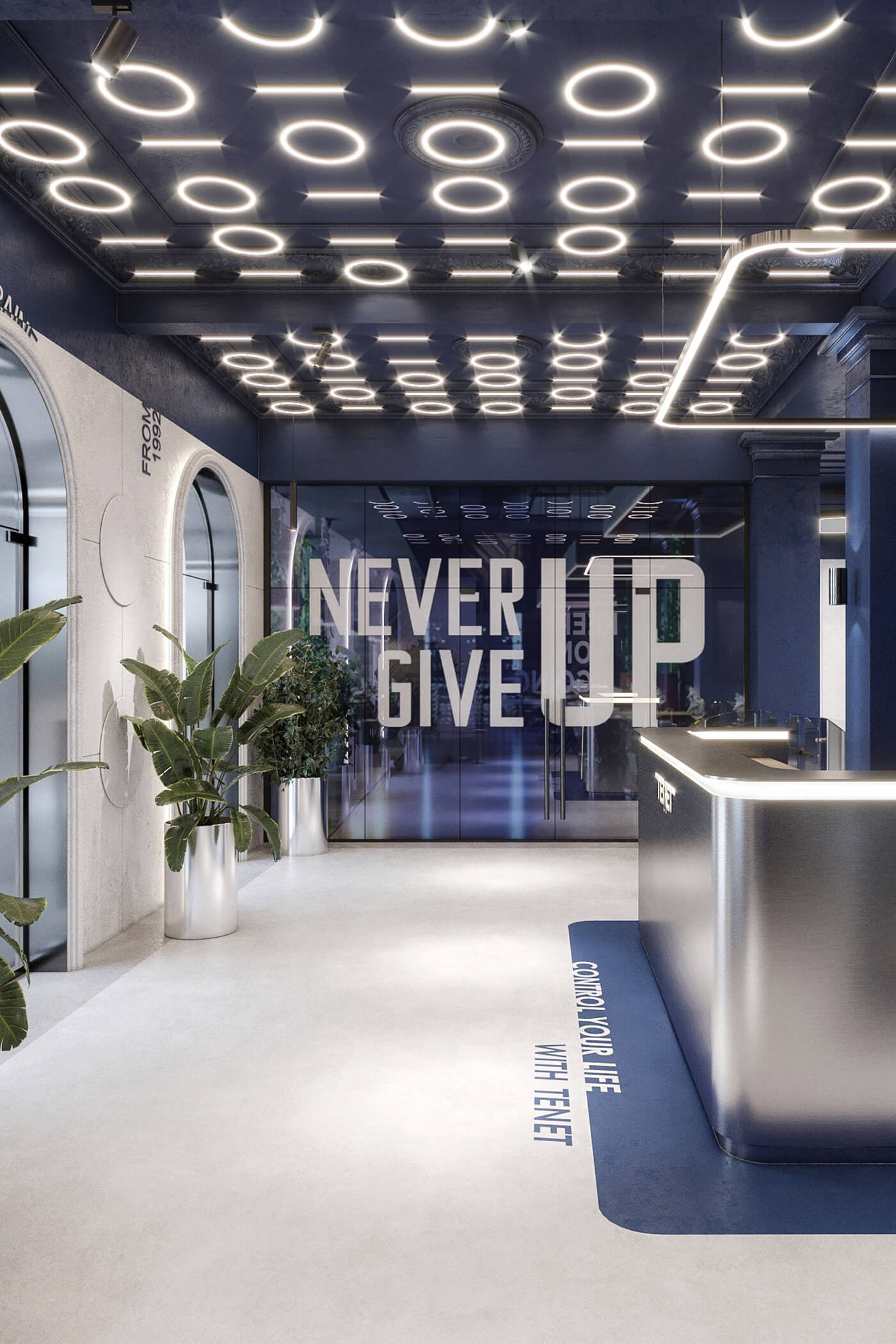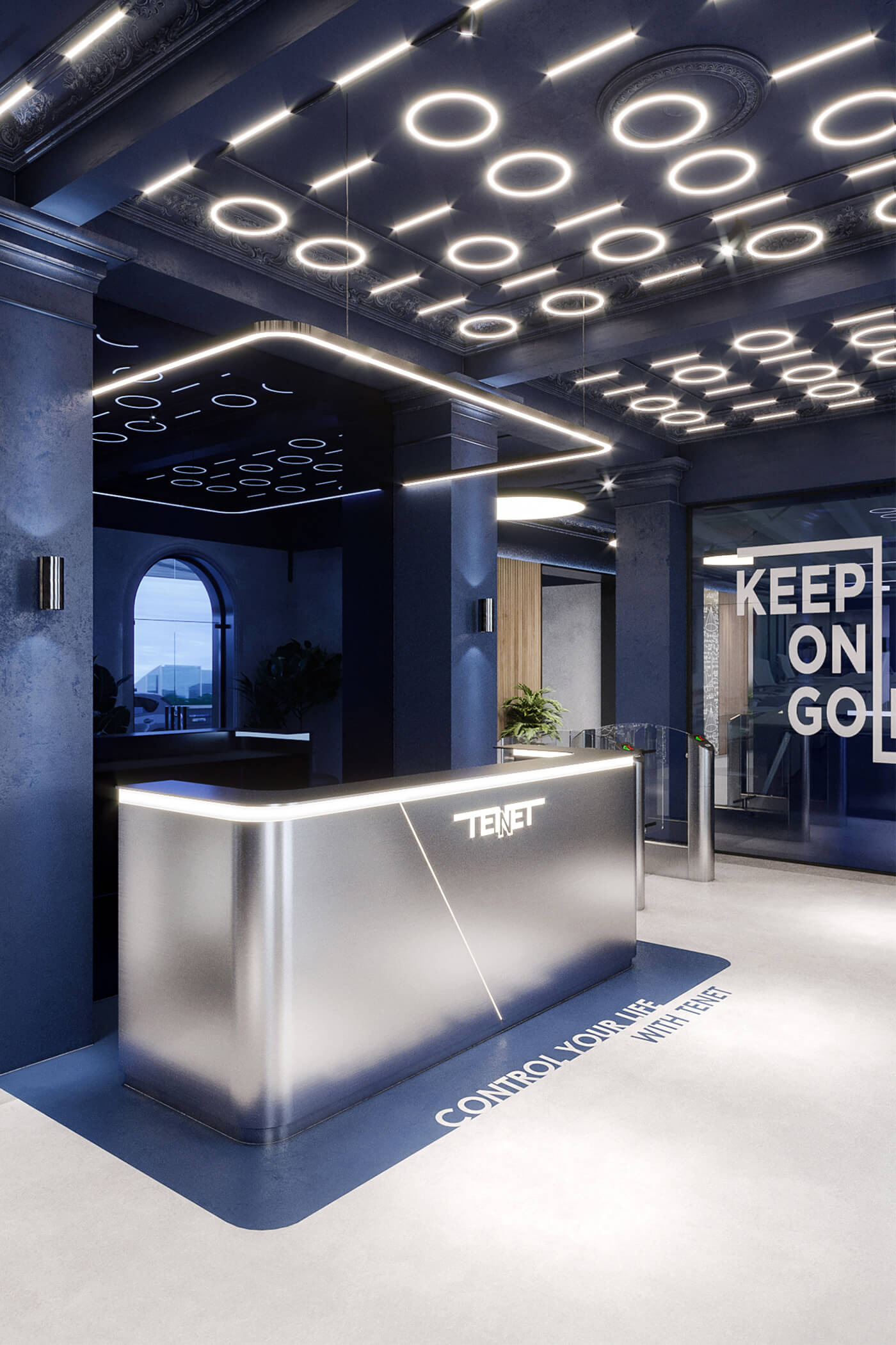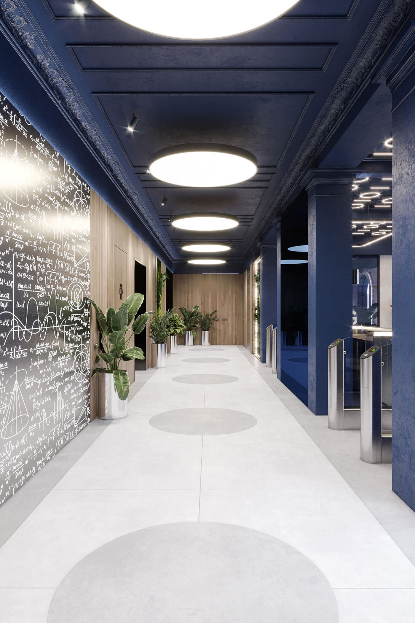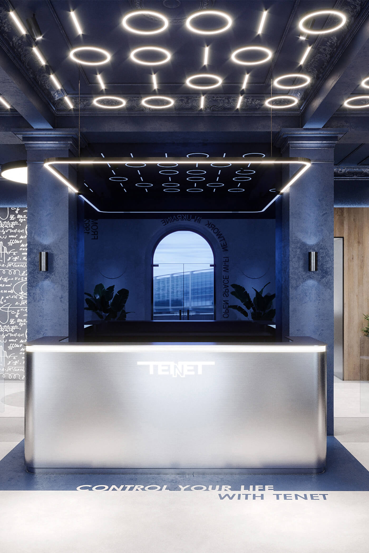 The company’s signature blue becomes the main accent of the interior, appearing in glass partitions and decorative details, reinforcing brand identity and adding a sense of dynamism. Neon lighting, arranged in the form of binary code, runs through the space, amplifying the digital atmosphere.