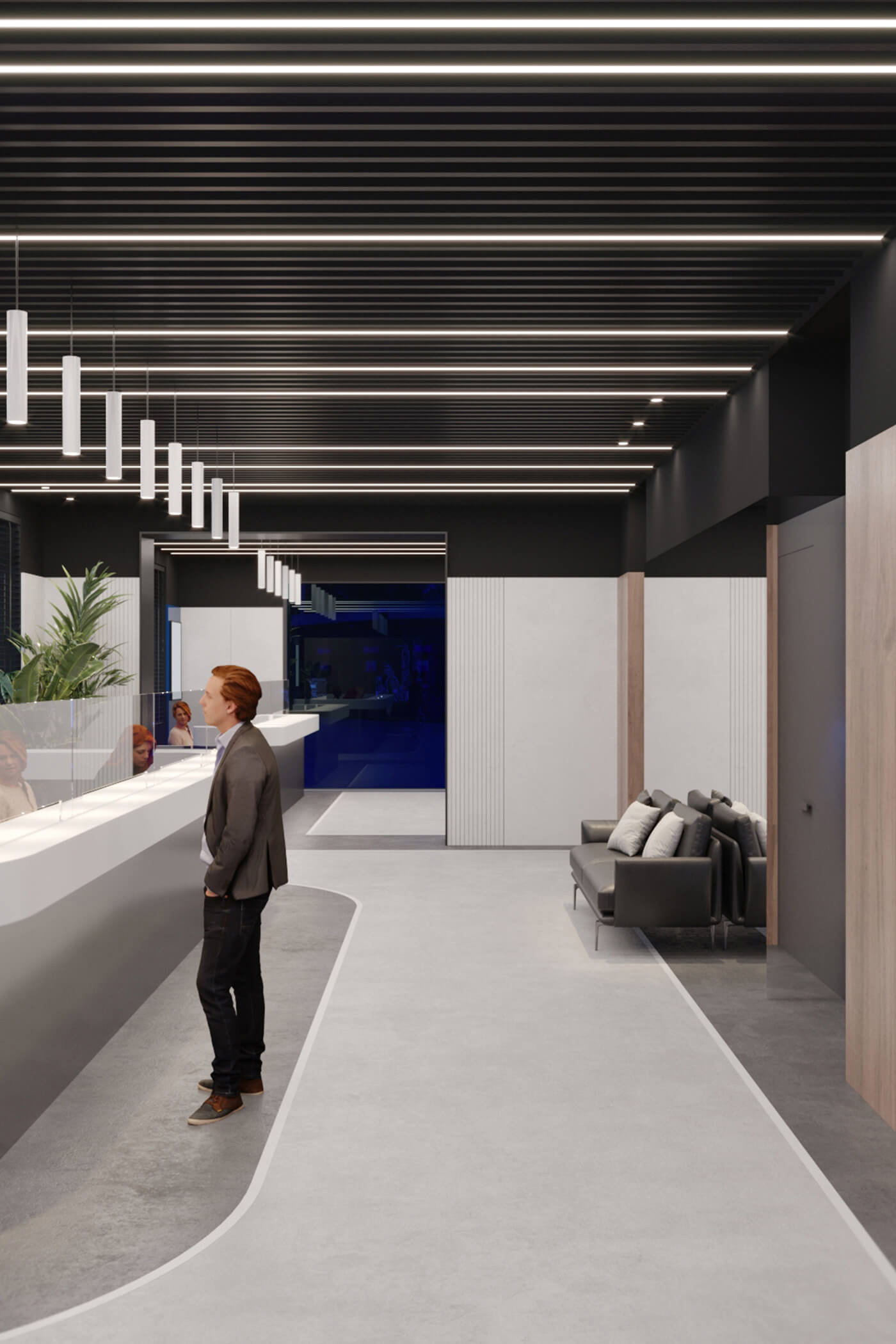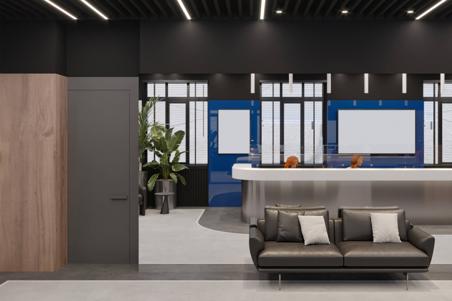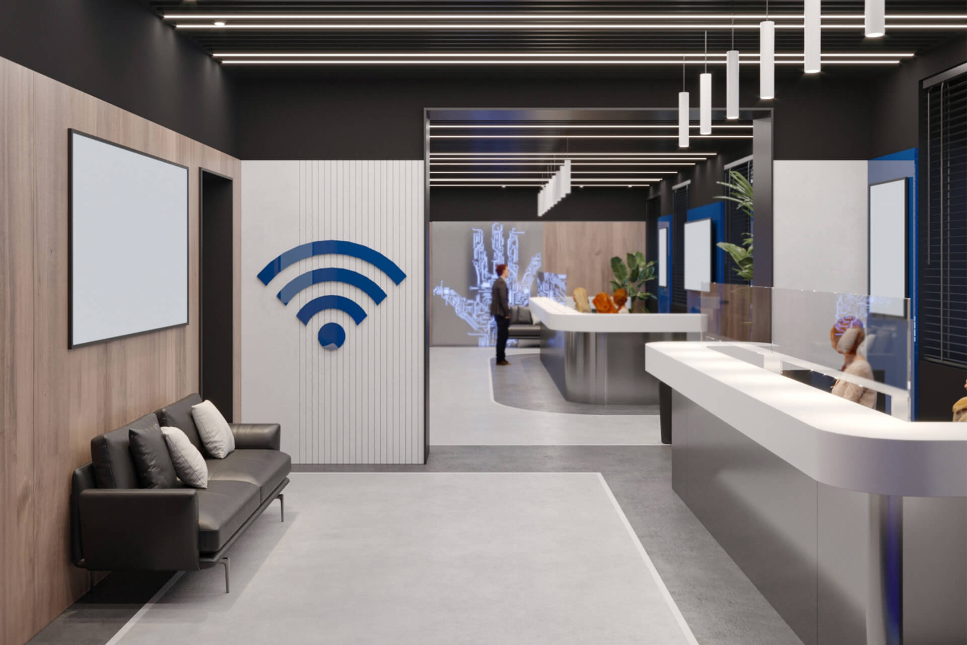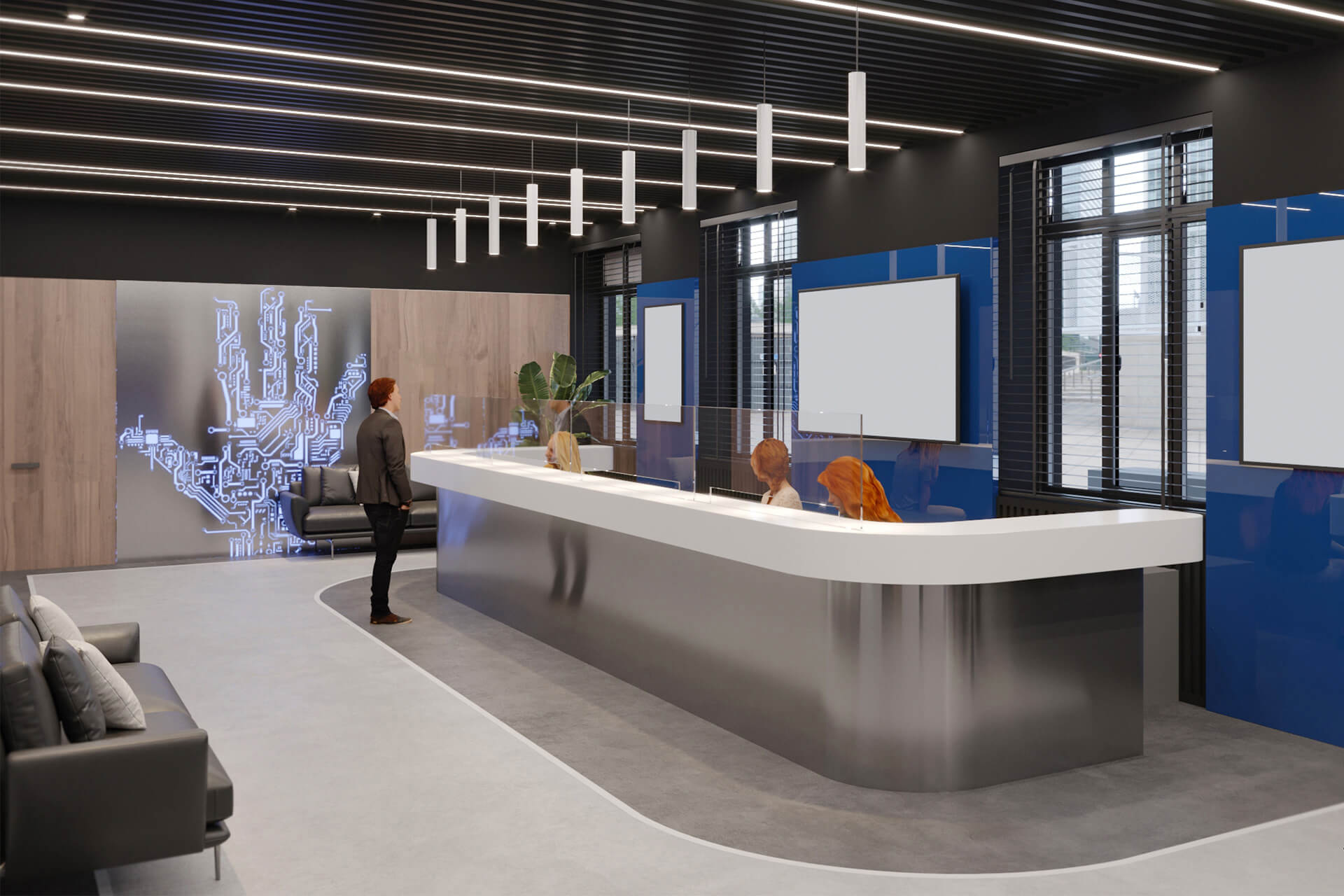 The company’s signature blue becomes the main accent of the interior, appearing in glass partitions and decorative details, reinforcing brand identity and adding a sense of dynamism. Neon lighting, arranged in the form of binary code, runs through the space, amplifying the digital atmosphere.