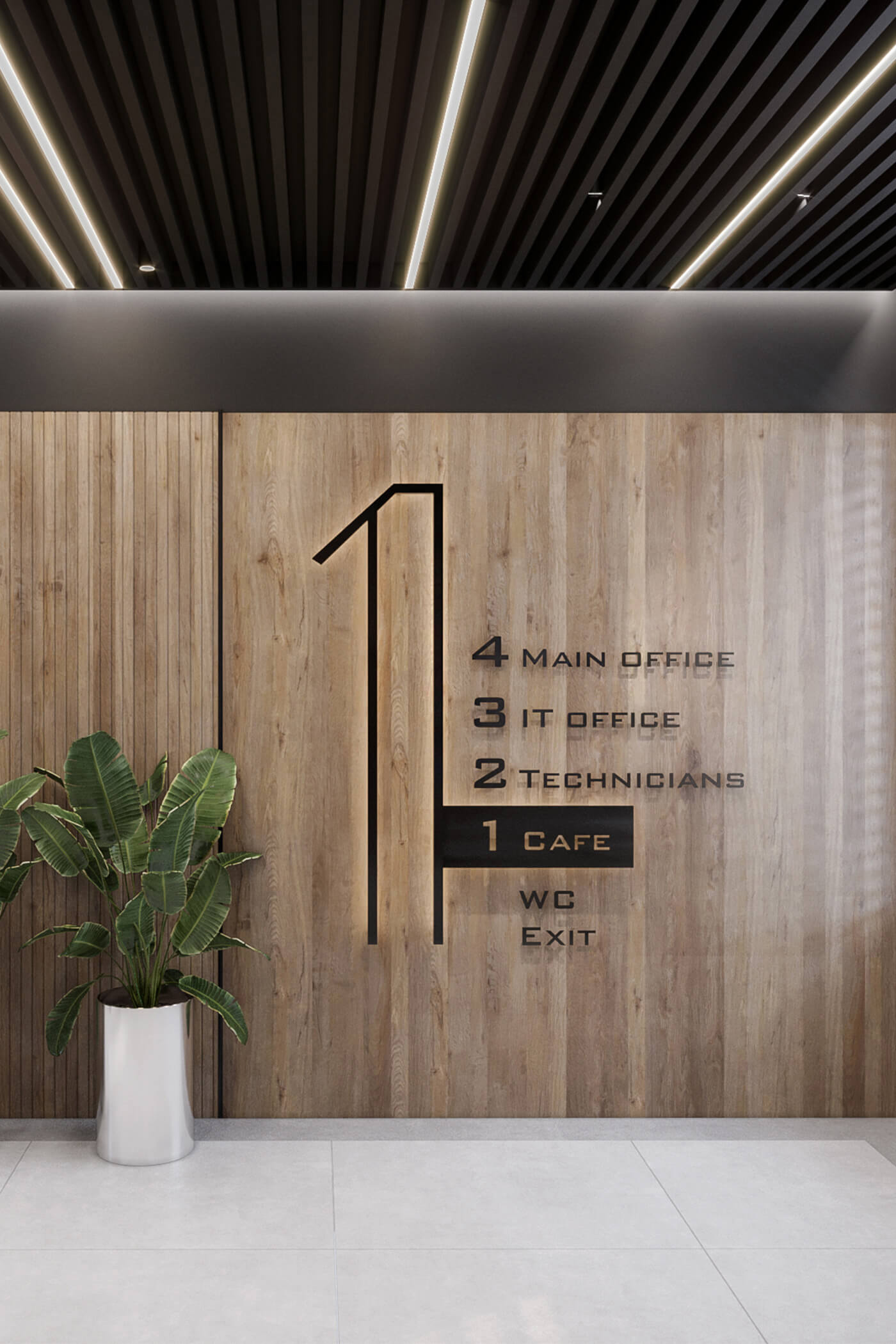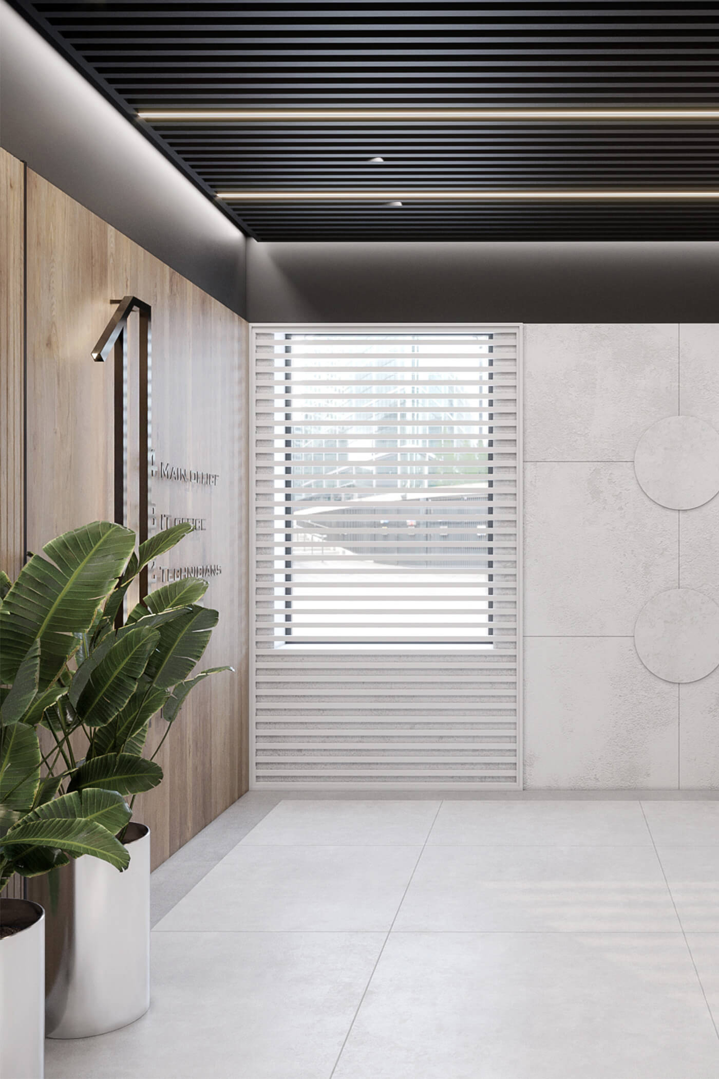 Metal shelving with natural stone and blackboards covered in formulas highlight the technological character of the environment, while a cybertruck-inspired reception desk makes an immediate statement about the company’s innovative spirit. Live plants integrated into the design bring warmth and harmony, softening strict lines and creating a comfortable, inspiring workspace.