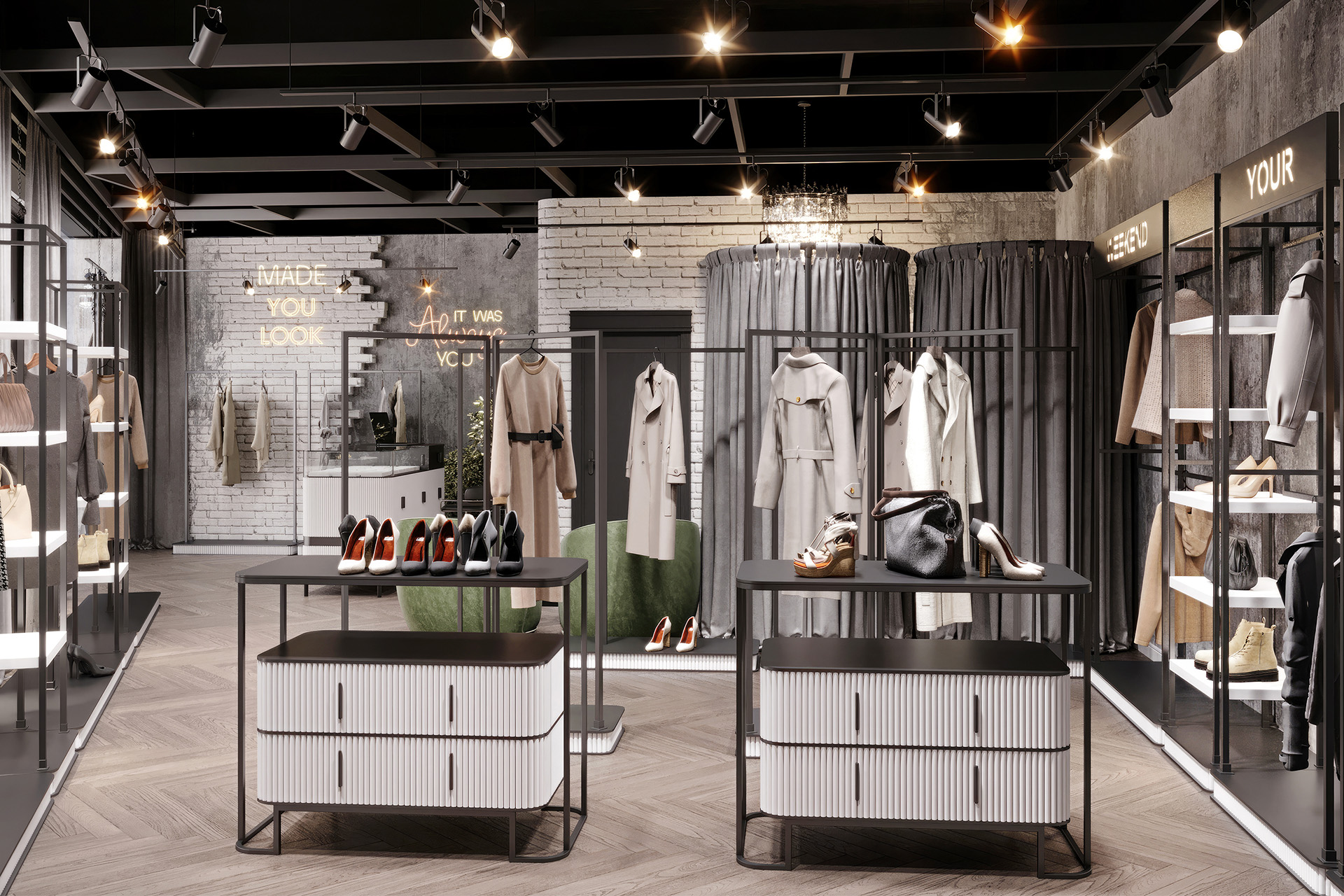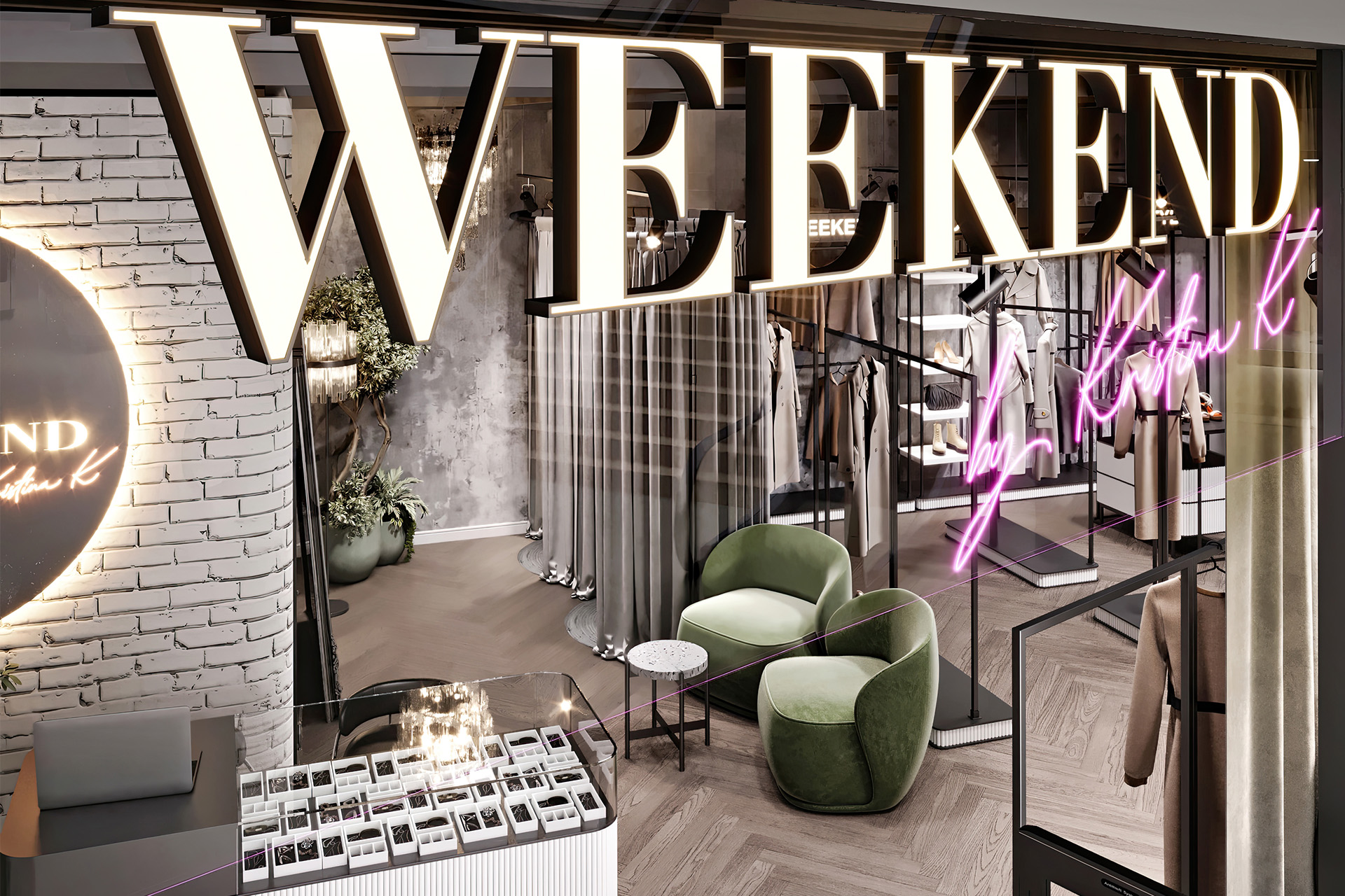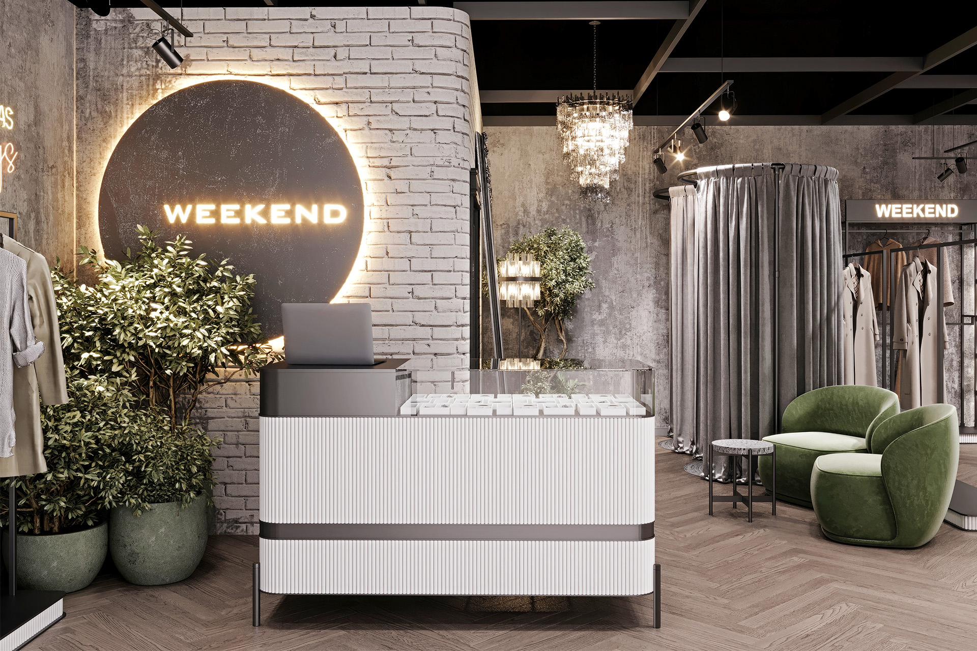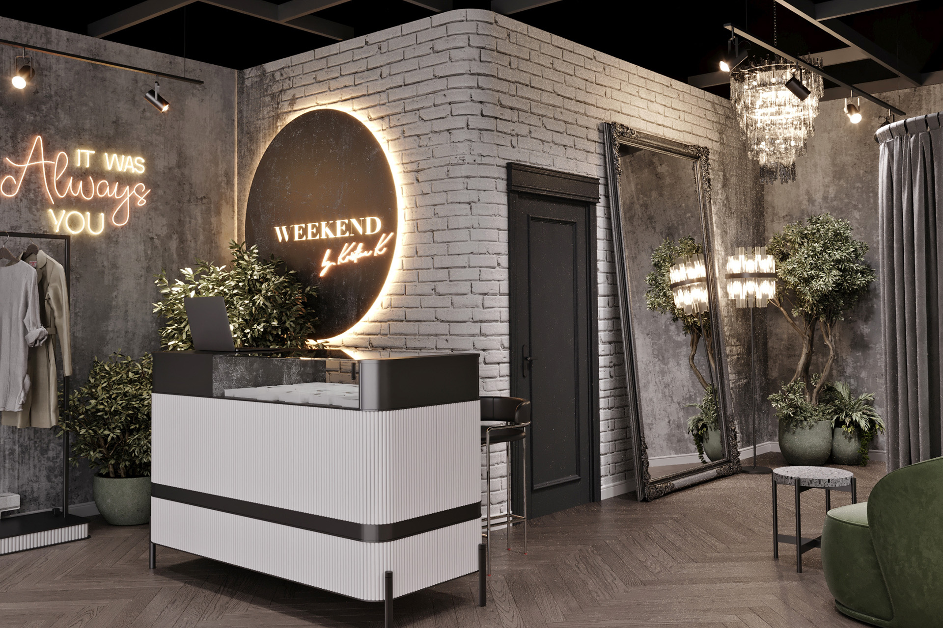 Women’s clothing store «Weekend» is about a modern loft style with a touch of gloss. Decorative plaster was used in the wall decoration, as well as chaotic brickwork with rounded corners, which makes it less rough. The creation of a soft interior is based on classic and premium decor elements, such as French chandeliers, a luxurious decorative mirror, majestic plants and a large number of curtains that create a boudoir effect. All equipment for things and the reception desk are designed by our studio individually according to the customer’s requests. The highlight of the design of the «Weekend» store is added by neon inscriptions, which have long been slogans and are associated with the brand of this store.