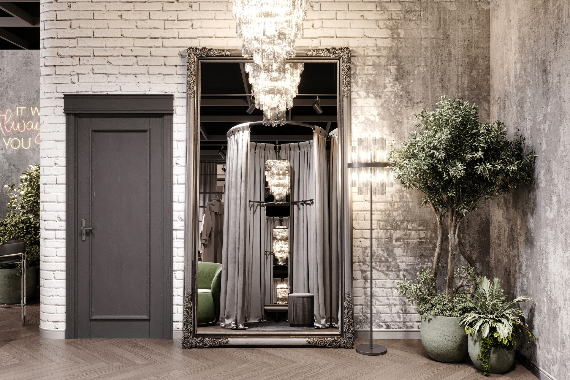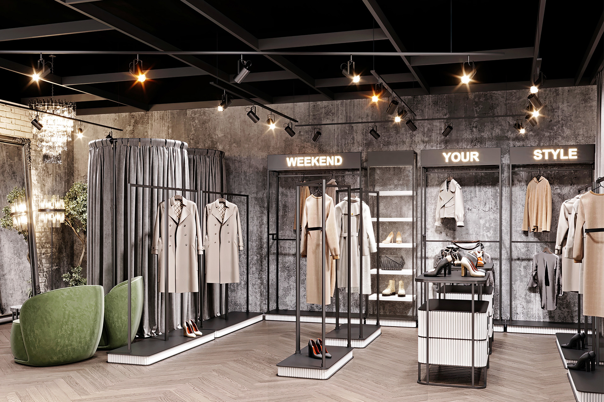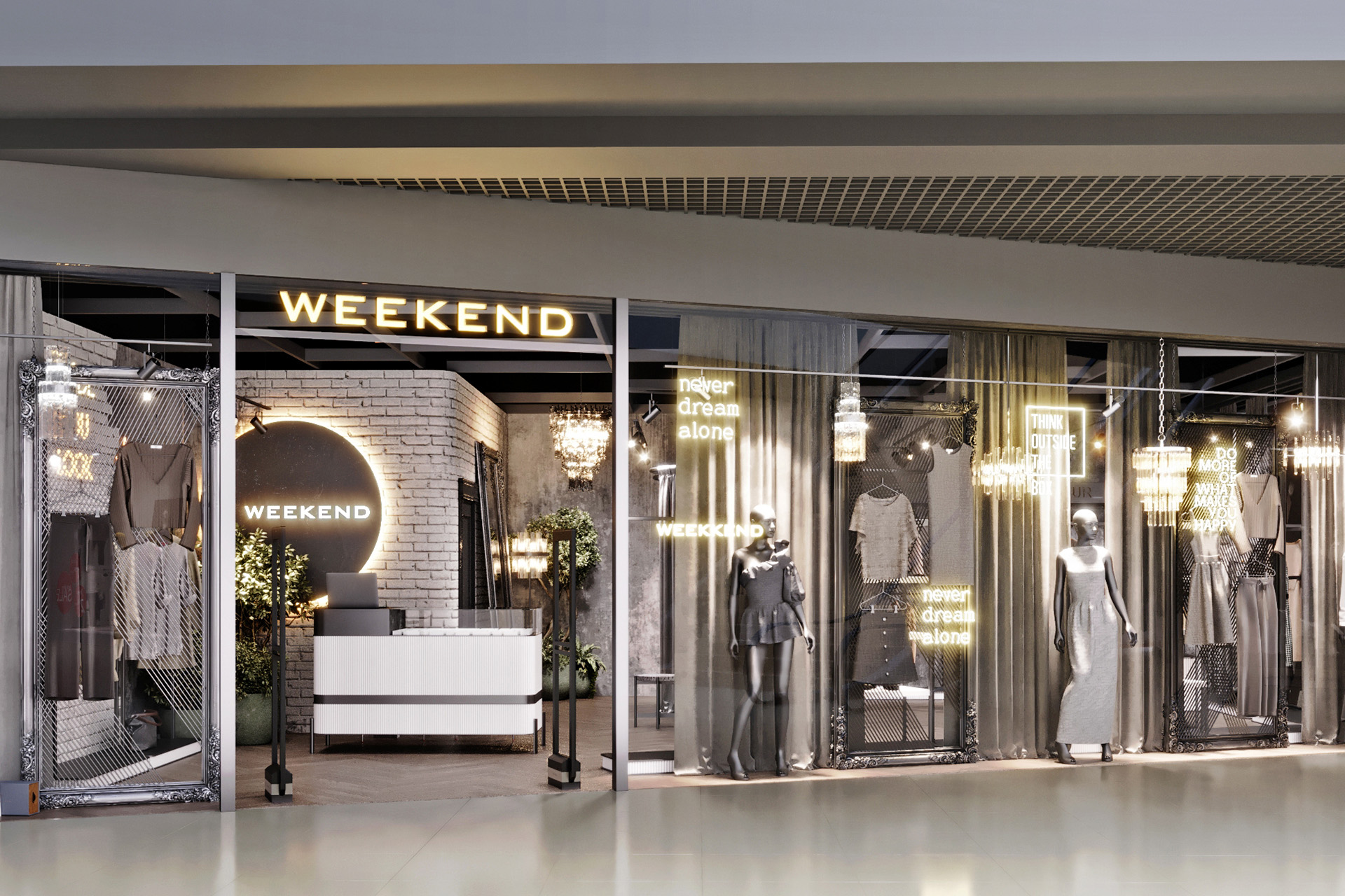 Women’s clothing store «Weekend» is about a modern loft style with a touch of gloss. Decorative plaster was used in the wall decoration, as well as chaotic brickwork with rounded corners, which makes it less rough. The creation of a soft interior is based on classic and premium decor elements, such as French chandeliers, a luxurious decorative mirror, majestic plants and a large number of curtains that create a boudoir effect. All equipment for things and the reception desk are designed by our studio individually according to the customer’s requests. The highlight of the design of the «Weekend» store is added by neon inscriptions, which have long been slogans and are associated with the brand of this store.
