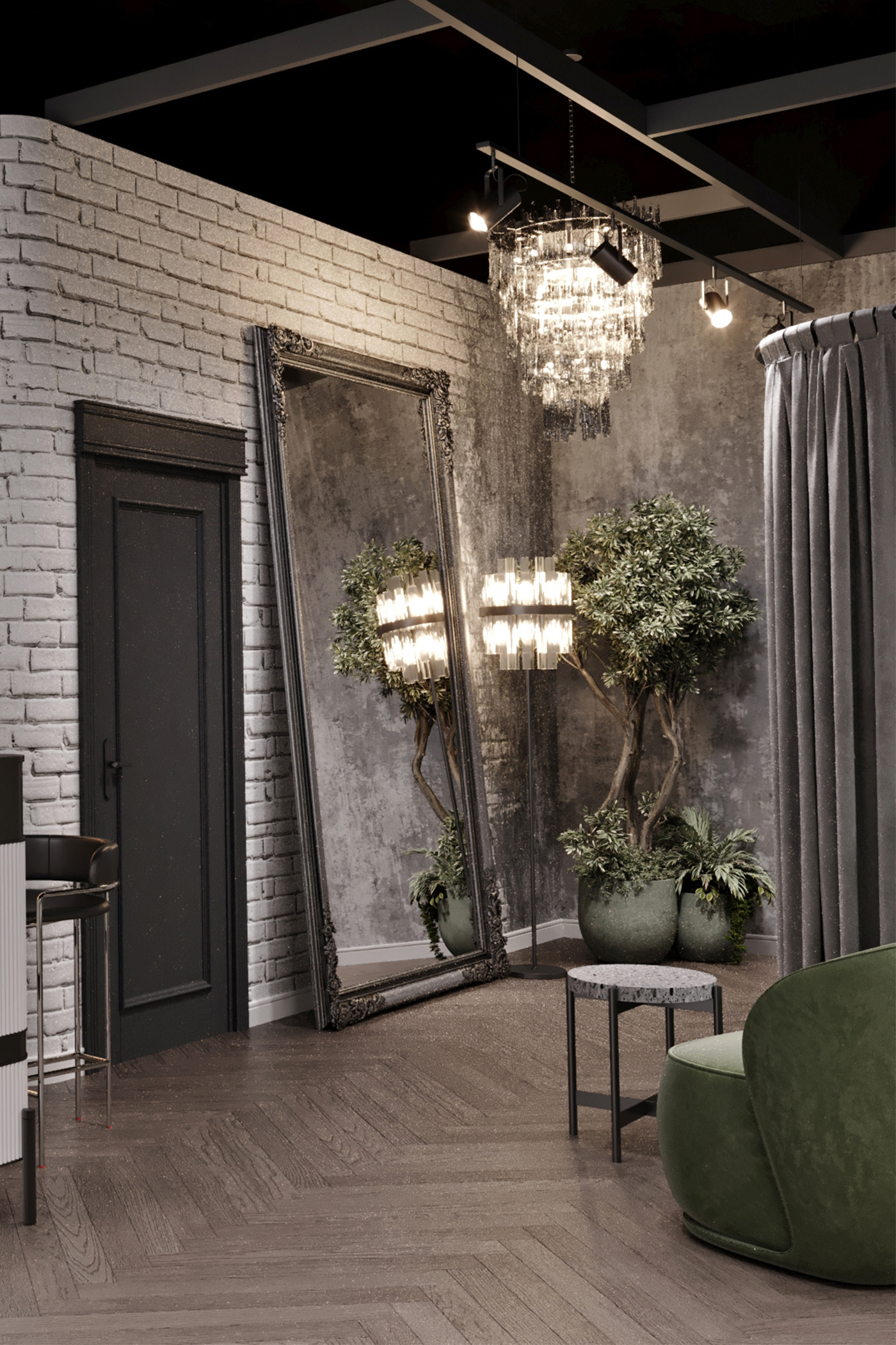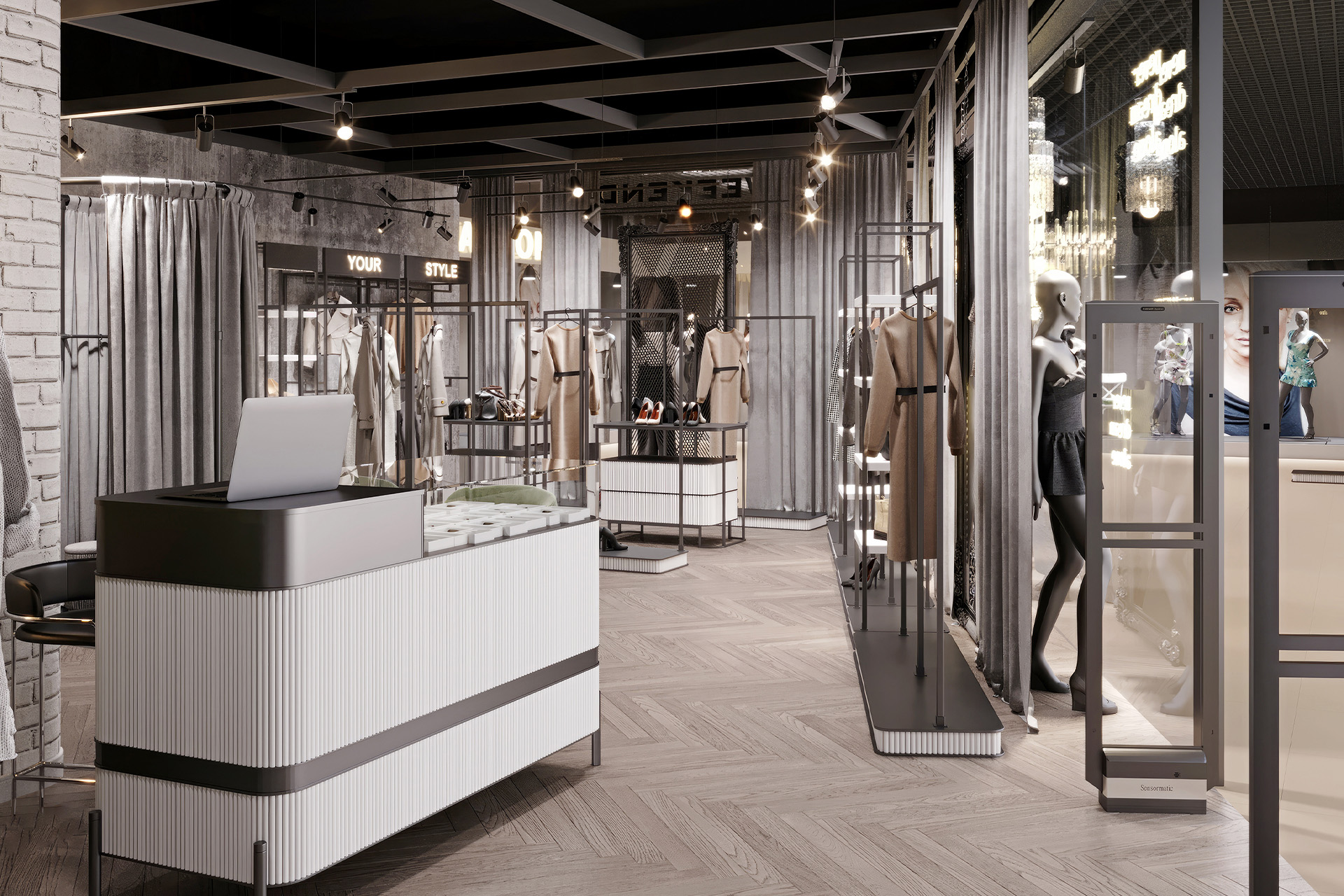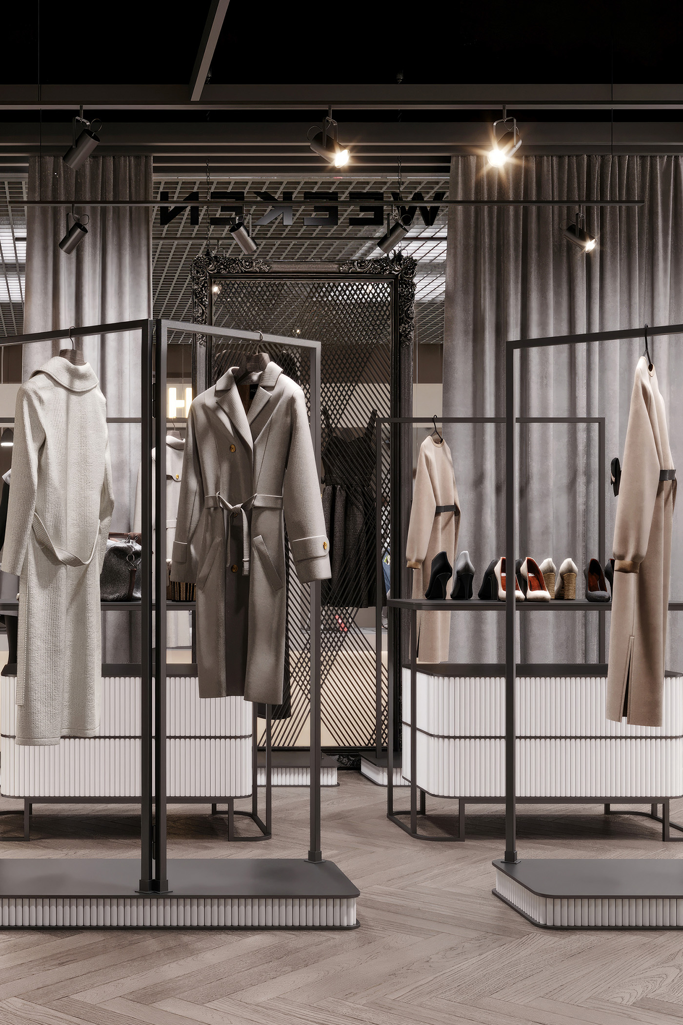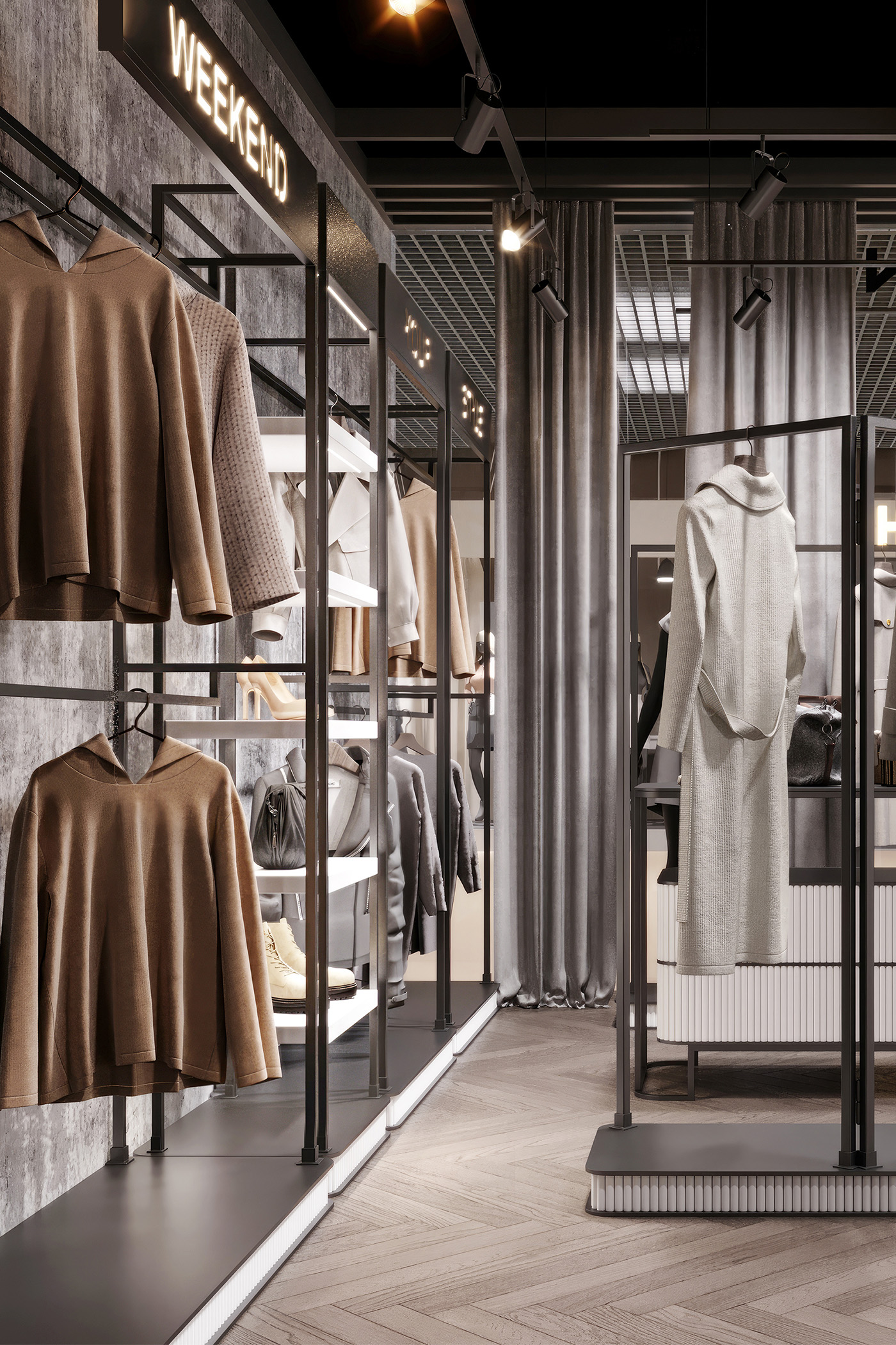 Women’s clothing store «Weekend» is about a modern loft style with a touch of gloss. Decorative plaster was used in the wall decoration, as well as chaotic brickwork with rounded corners, which makes it less rough. The creation of a soft interior is based on classic and premium decor elements, such as French chandeliers, a luxurious decorative mirror, majestic plants and a large number of curtains that create a boudoir effect. All equipment for things and the reception desk are designed by our studio individually according to the customer’s requests. The highlight of the design of the «Weekend» store is added by neon inscriptions, which have long been slogans and are associated with the brand of this store.